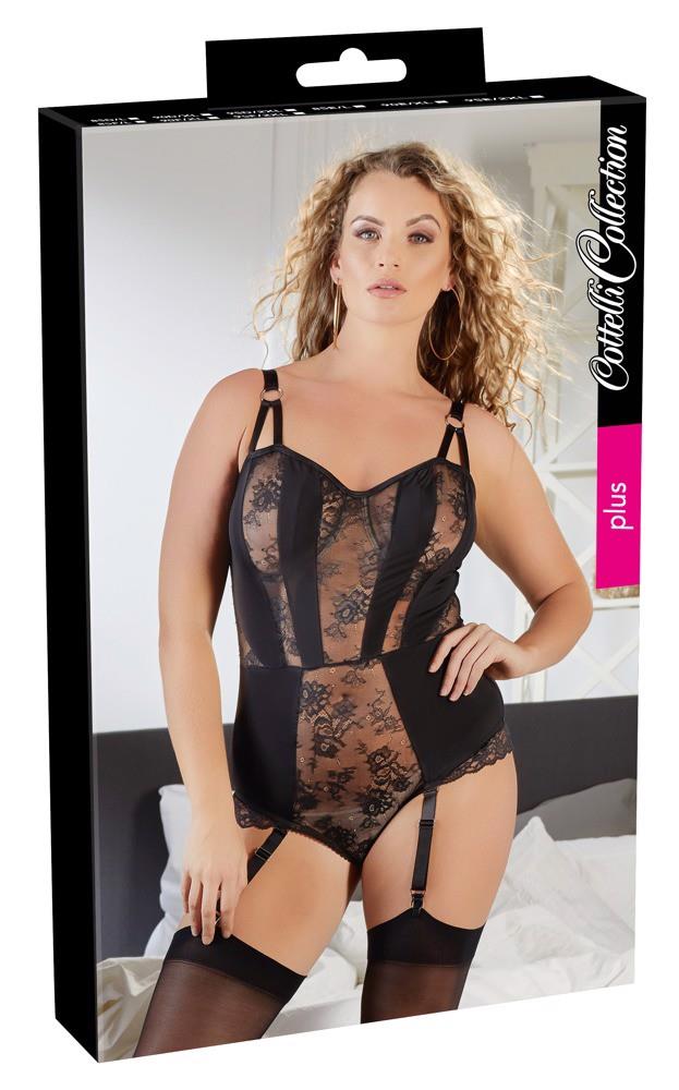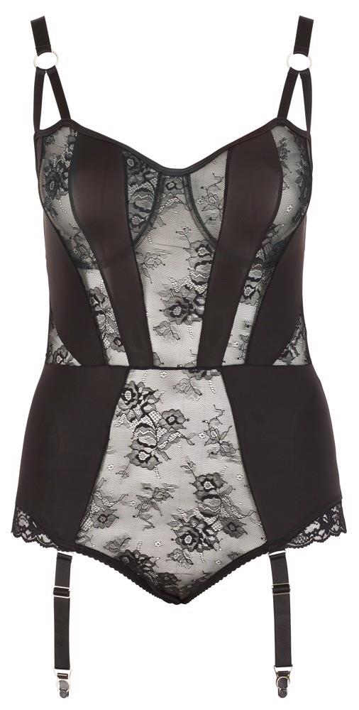 Z pochlebstwem dla figury!Ciało z półprzezroczystymi wstawkami z koronki kwiatowej od dekoltu do krocza. Z tyłu również z kwiatową koronką i zapięciem na haczyk. Z przyjemnie szerokimi, regulowanymi paskami z przodu w srebrnym kolorze pierścionków ozdobnych. Korpus jest zamknięty zatrzaskami w kroczu. W zestawie z regulowanymi i zdejmowanymi szelkami.95% poliester, 5% elastan; koronka 90% poliamid, 10% elastan.