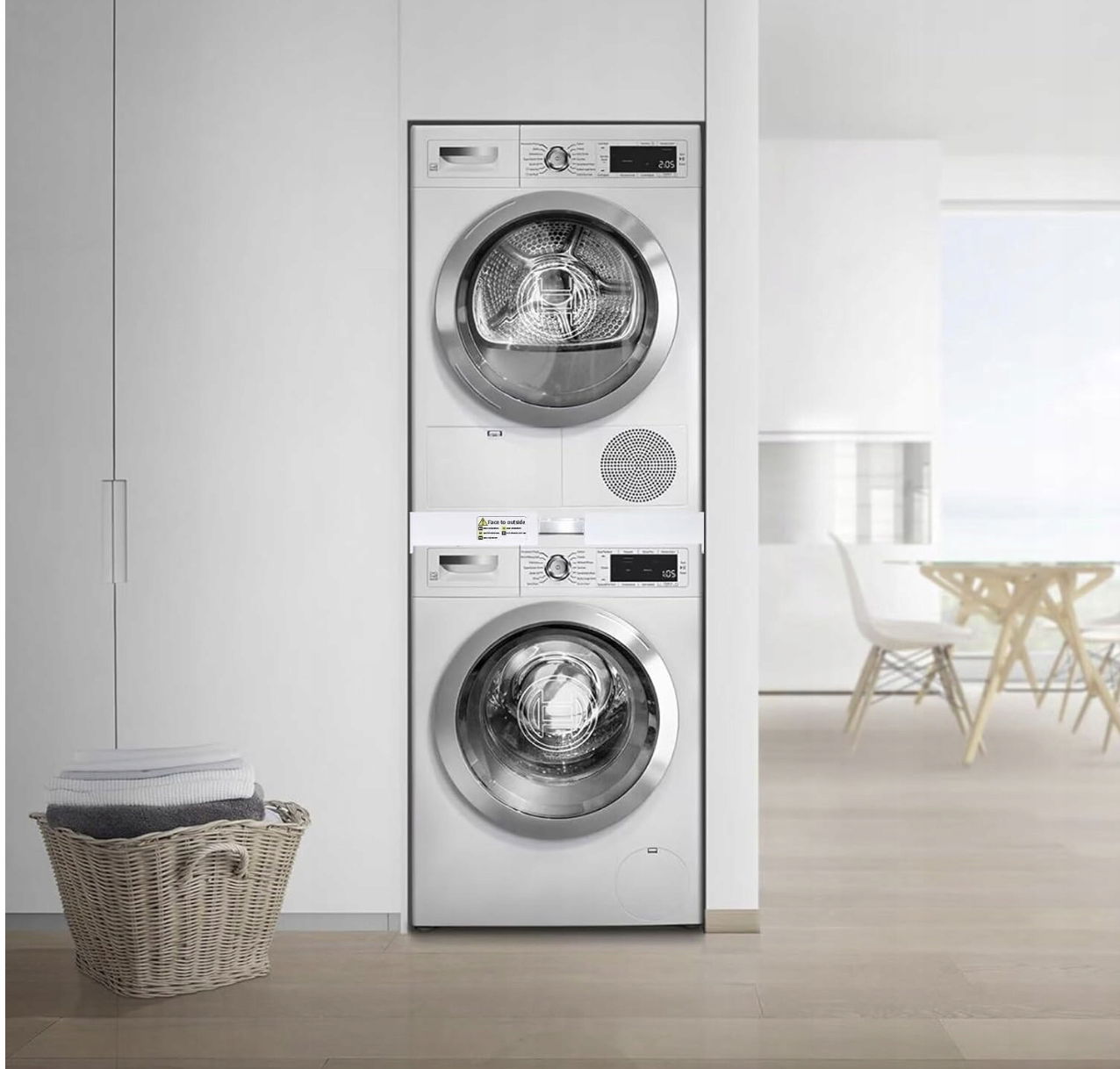 ✅ Zaoszczędź przestrzeń: Dzięki łącznikowi pralka i suszarka mogą być ustawione jeden na drugim, co pomaga zaoszczędzić cenną przestrzeń w łazience lub pralni.