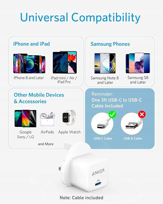 Co otrzymasz: Ładowarka Anker (20 W) / PowerPort III 20 W Cube z 3-stopowym kablem USB-C do USB-C
