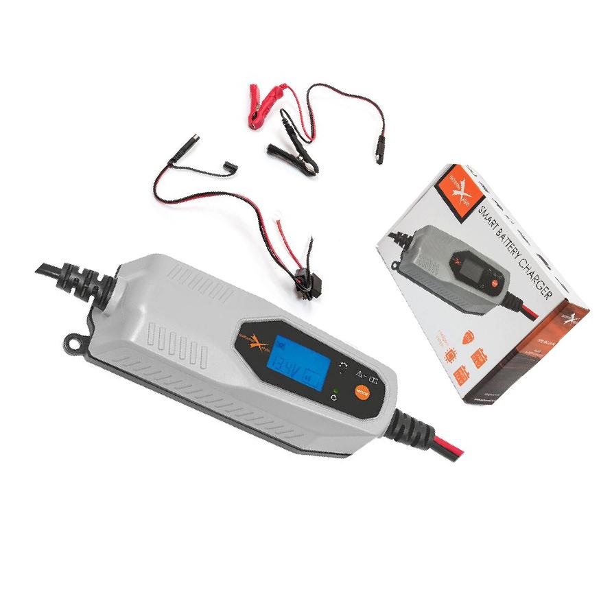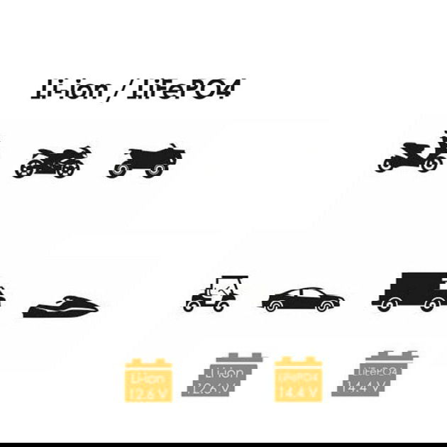 % inteligentna ładowarka SBC-LI144 przeznaczona do ładowania akumulatorów litowych znajdujących się w motocyklach, skuterach, skuterach śnieżnych, ATV. Ładowarka jest w pełni automatyczna, sterowana mikroprocesorem. Po pełnym naładowaniu automatycznie wyłącza się, przechodząc w tryb monitorowania napięcia - w 100 bezpieczna dla każdego akumulatora.Ładowarka została wyposażona w rozłączany kabel z szybko-złączem SAE oraz kompletem dodatkowych złączy (krokodylki i terminale oczkowe).