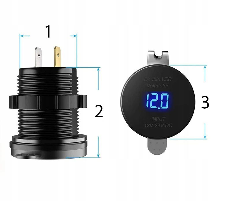 Wysokiej jakości ładowarka samochodowa z cyfrowym woltomierzem, przeznaczona do zabudowy w otworze 2,87cm.