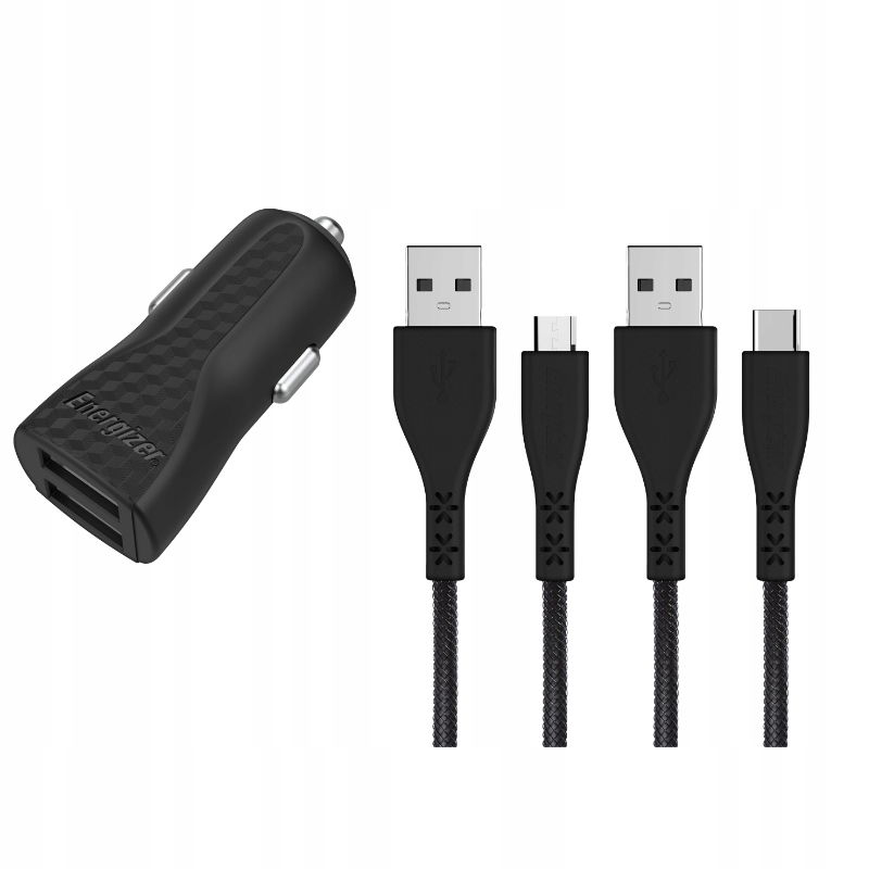 Energizer HardCase - Ładowarka samochodowa 2x USB-A 2.4A + Kabel USB-C & Micro USB (Czarny)