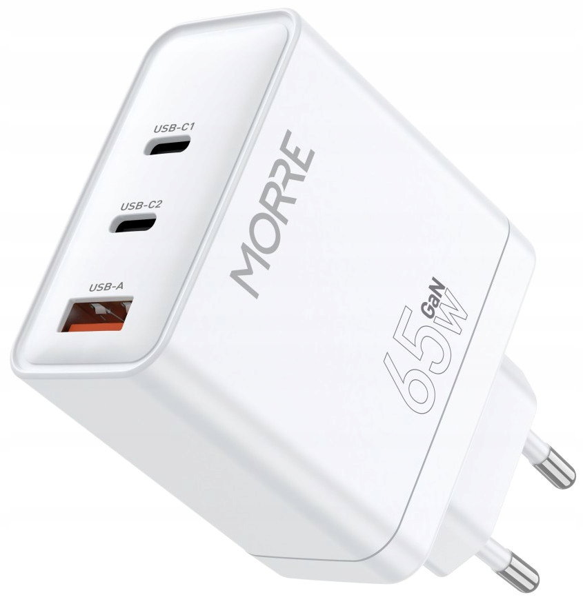 Kompaktowa ładowarka wyposażona w 3 porty – USB-A (30W) i 2x USB-C (65W) to doskonałe rozwiązanie do ładowania urządzeń w domu, biurze, czy podczas podróży.