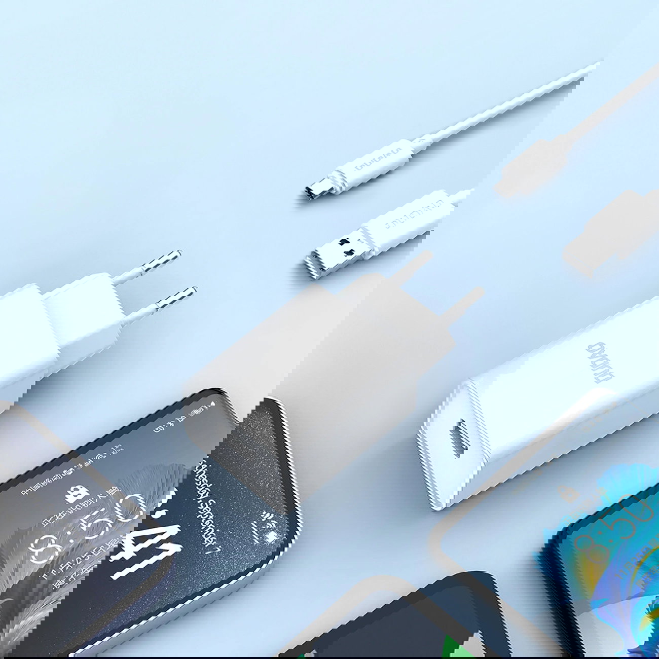 - - Ładowarka sieciowa USB-A 2.1A + kabel USB-A - microUSB - biała