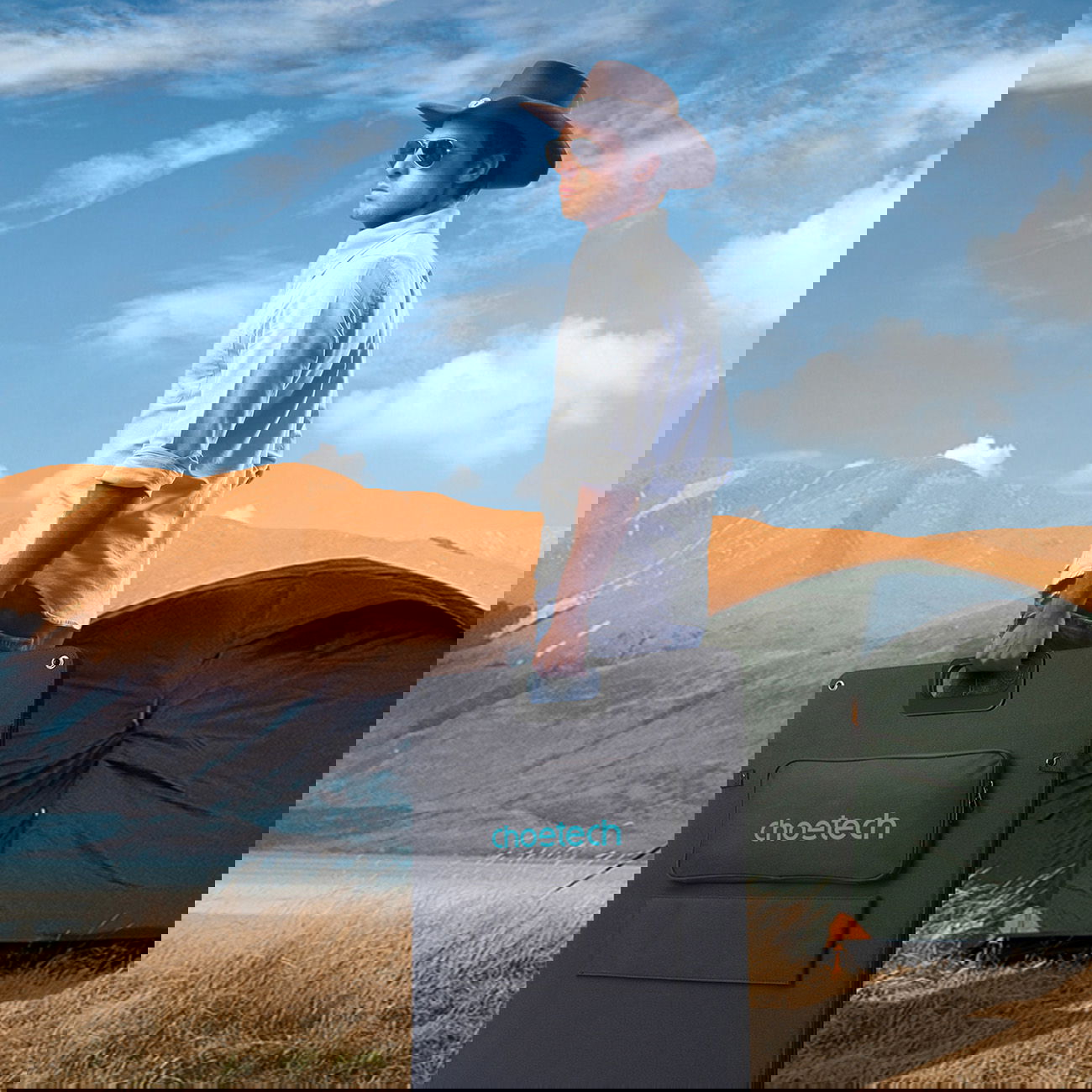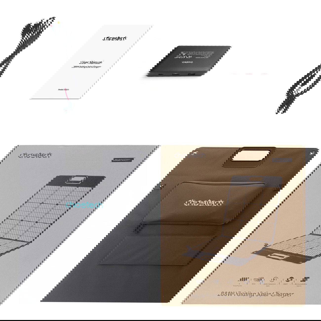 Kod produktu: 1016721Składana ładowarka solarna 200 W Choetech - przenośny panel słoneczny (SC011) Interesuje Cię przenośny panel słoneczny? Postaw na Choetech SC011. To składana ładowarka solarna 200 W, która perfekcyjnie sprawdzi się jako zestaw solarny do kampera. Będzie świetnym wyborem dla wszystkich, które cenią sobie dużą moc, kompaktowe wymiary i niewielką wagę. Wykorzystasz ją podczas wszelkich wyjazdów: nie tylko kamperem, ale i przyczepą kempingową, busem lub samochodem na zagraniczne wakacje. Przekształci energię słoneczną w elektryczną w każdych warunkach atmosferycznych. Dzięki materiałowi Oxford ładowarka solarna 200 W Choetech jest wodoodporna (na poziomie IPX65) i trwała. Ma solidną, mocną konstrukcję, którą możesz ustawić pod kątem 45 stopni.Najważniejsze zalety przenośnego panelu słonecznego Choetech SC011: