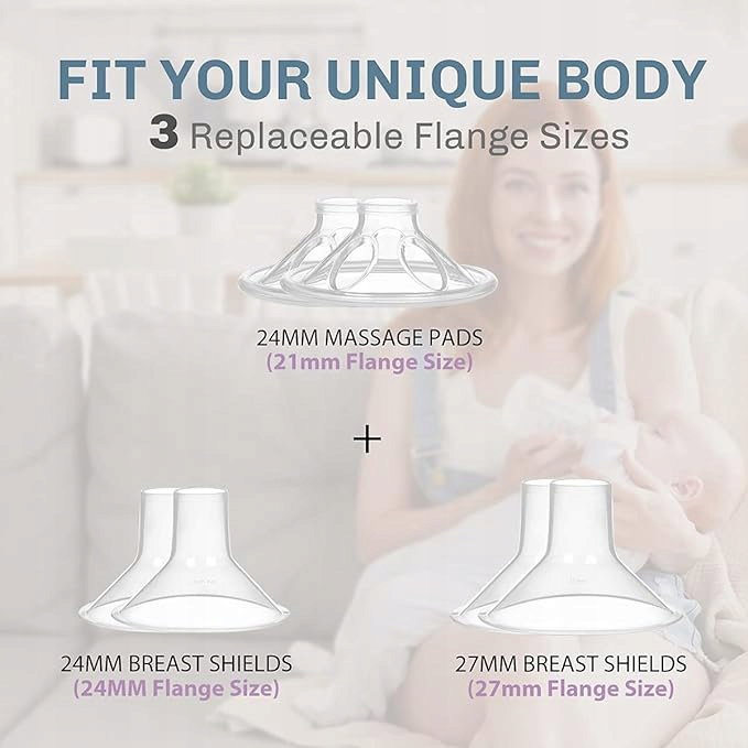 - Kołnierz w wielu rozmiarach i łatwy do czyszczenia : Kołnierz na piersi jest dostępny w 3 rozmiarach: 21 mm, 24 mm i 27 mm. Każdy komponent naszej podwójnej pompki do mleka może być dowolnie montowany i demontowany. Z wyjątkiem części elektrycznych wszystkie pozostałe zdejmowane części nadają się do mycia w zmywarce.