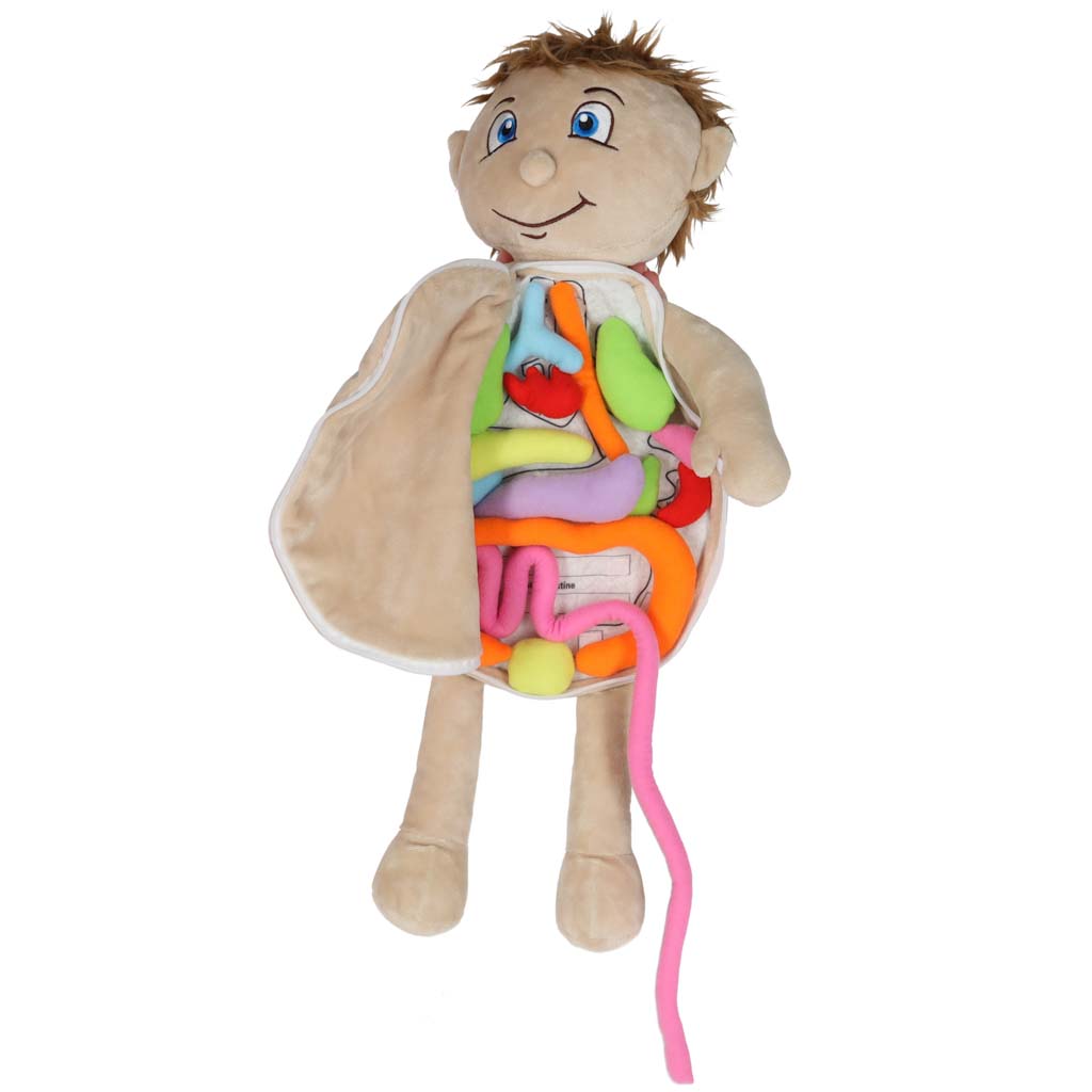 NAUKA PRZEZ ZABAWĘ I DOŚWIADCZENIE - Ta lalka edukacyjna pozwala dzieciom w prosty i ciekawy sposób poznać budowę ciała człowieka. W jej wnętrzu znajdują się miękkie, kolorowe narządy przymocowane na rzepy, które można wyjmować i ponownie układać w odpowiednich miejscach. Każdy element ma realistyczny kształt, przyjemną w dotyku strukturę oraz podpis w języku angielskim, co ułatwia zapamiętywanie nazw organów i wprowadza dziecko w świat nauki w sposób atrakcyjny i angażujący.