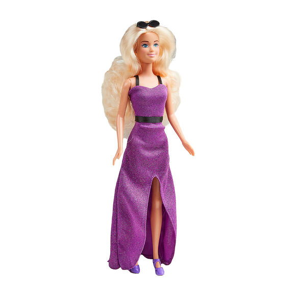 Opis elementów: lalka, długa suknia, buty x 2, sukienka mini, torebka, okulary
