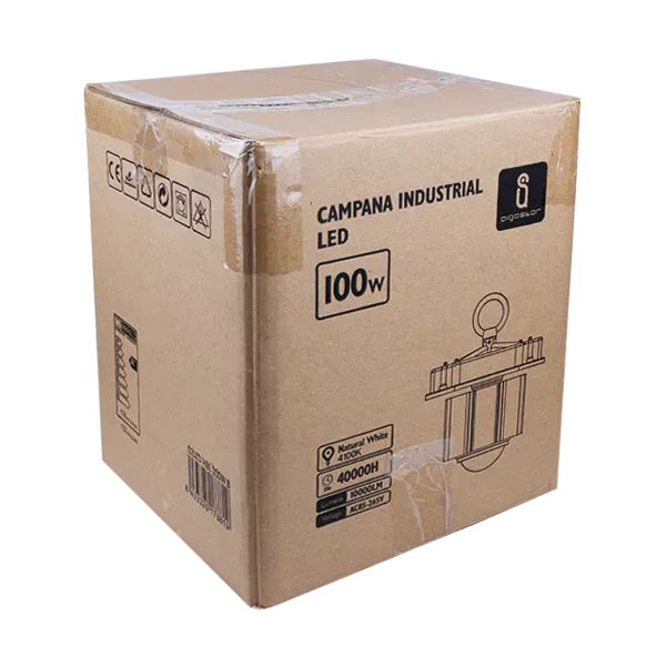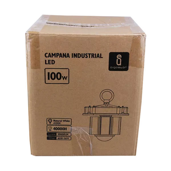 Lampa przemysłowa 100W/230V z aluminiowym kloszem, strumień świetlny 10000lm biała zimna 6500K. Średnica rozpraszającego klosza 50 cm, wysokość całkowita 50cm. Przeznaczona do pomieszczeń produkcyjnych, magazynowych i warsztatowych. Duży odbłyśnik zapewnia dobre rozproszenie światła. Masywny oksydowany radiator skutecznie odprowadza ciepło emitowane przez moduły COB, co znacząco wpływa na wydłużenie żywotności lampy.