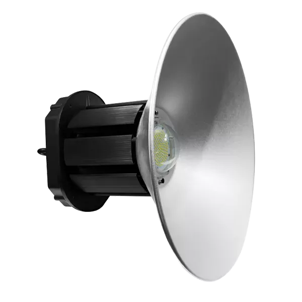 Lampa przemysłowa 150W/230V z aluminiowym kloszem, strumień świetlny 15000lm biała zimna 6500K. Średnica rozpraszającego klosza 50 cm, wysokość całkowita 47cm. Przeznaczona do pomieszczeń produkcyjnych, magazynowych i warsztatowych. Duży odbłyśnik zapewnia dobre rozproszenie światła. Masywny oksydowany radiator skutecznie odprowadza ciepło emitowane przez moduły COB, co znacząco wpływa na wydłużenie żywotności lampy.