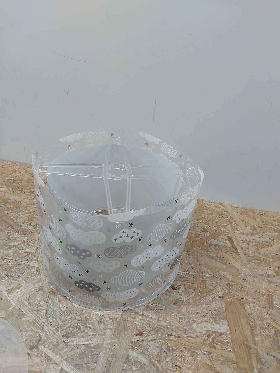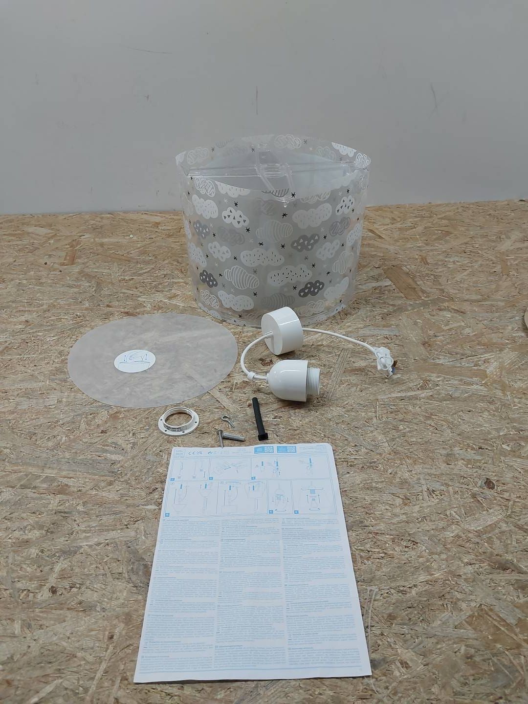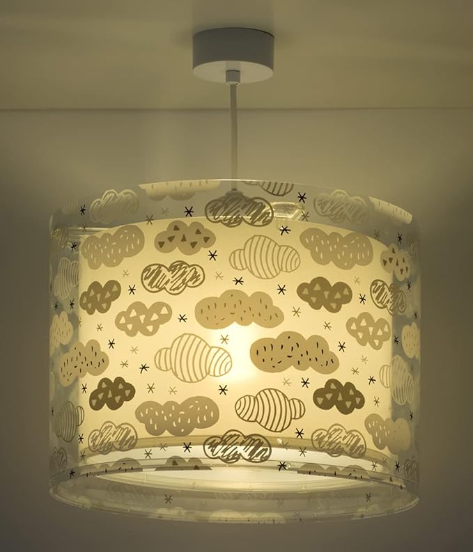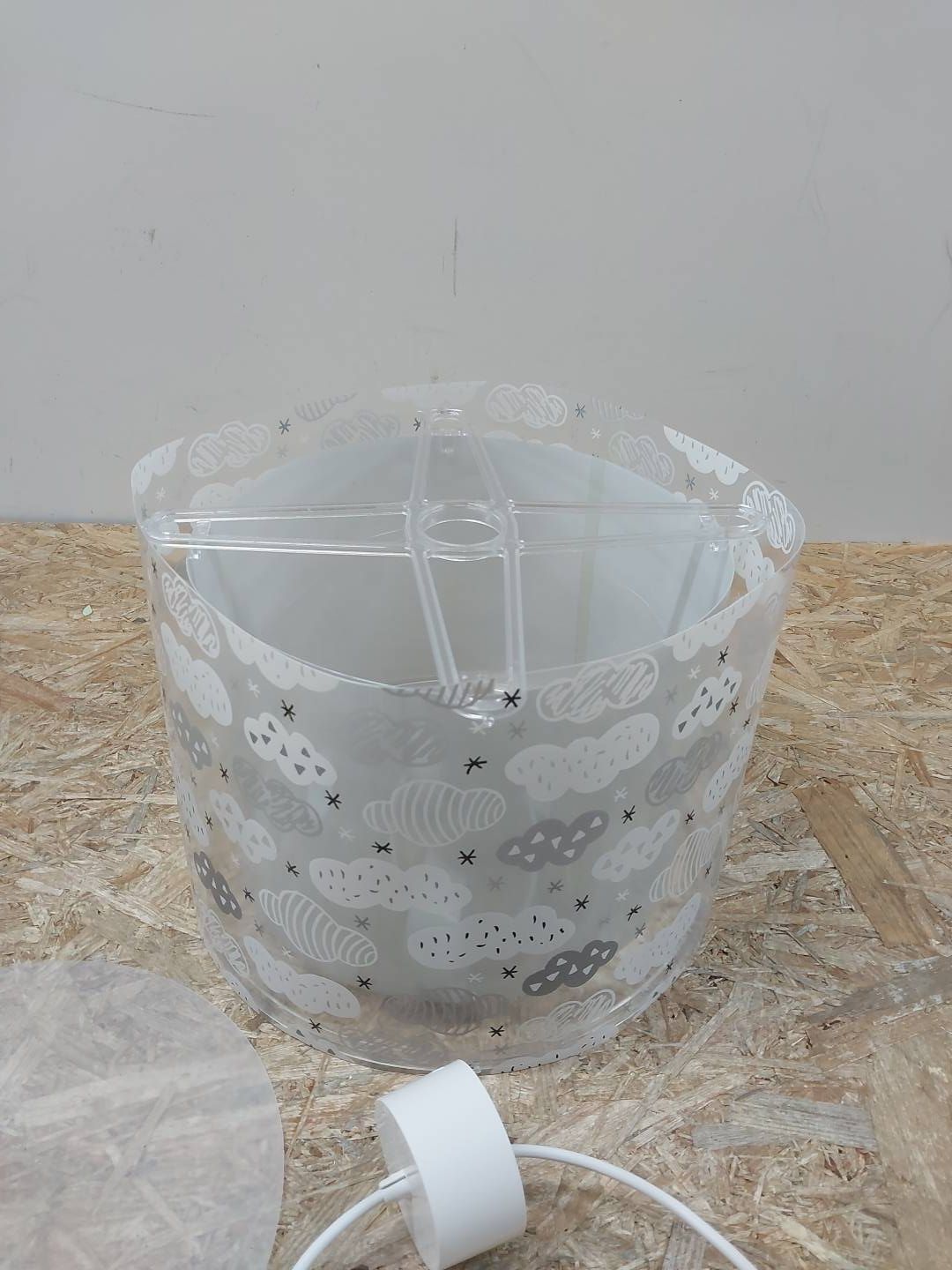 Lampa wisząca dla dzieci z chmurkami. Wykonana z tworzywa sztucznego, o rozmiarach 33 x 33 x 25 cm. Posiada regulację wysokości oraz zdejmowany dyfuzor światła. Żarówka nie jest dołączona.