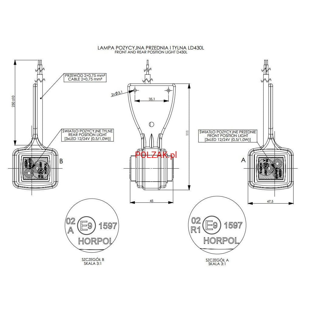 NOWA Lampa obrysowa LED 2 kolorowa PRAWA 12V - 24V gabarytowa narożna wisząca