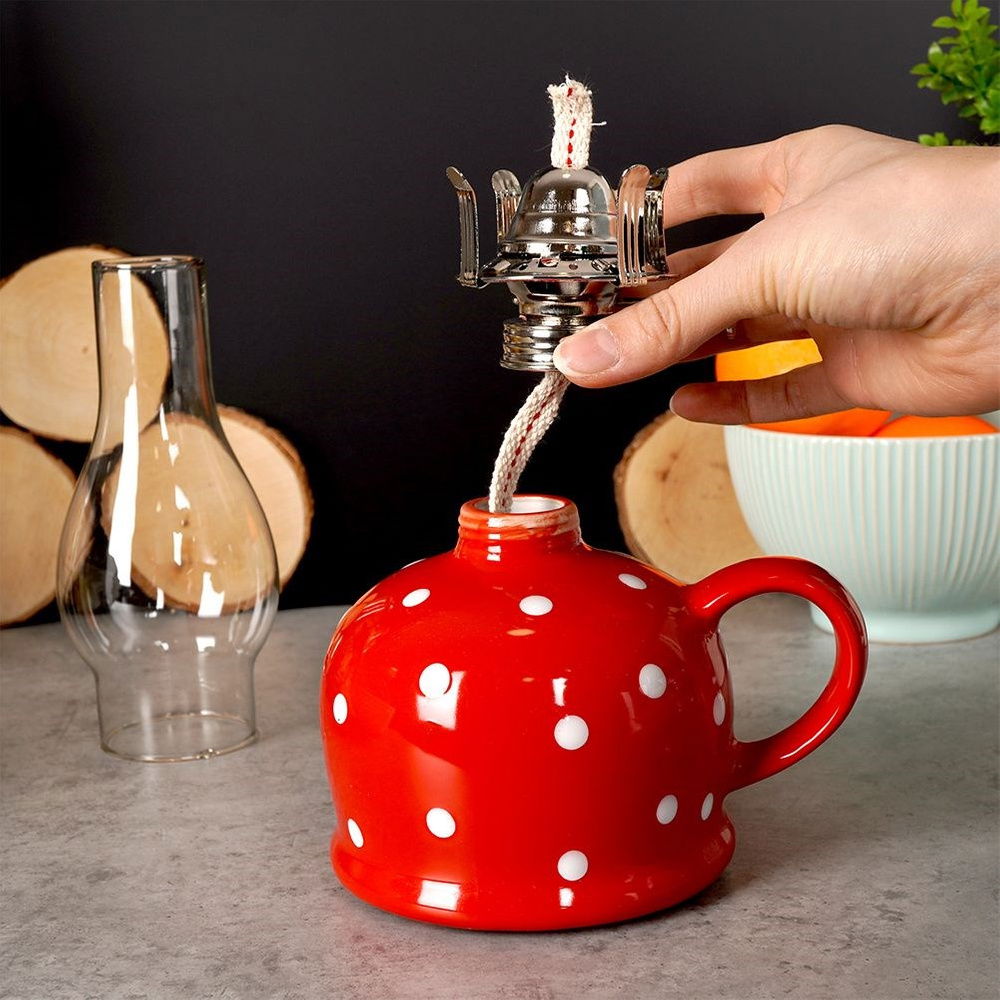 SOLIDNA - Efektowna lampa naftowa z wygodnym uchwytem. Klosz lampy wykonany ze szkła, które jest odporne na wysoką temperaturę oraz dobrze przepuszcza światło. Zbiornik na naftę wykonany jest z ceramiki w czerwonym kolorze z białymi kropkami. Wysokość lampy wynosi 28,5 cm.