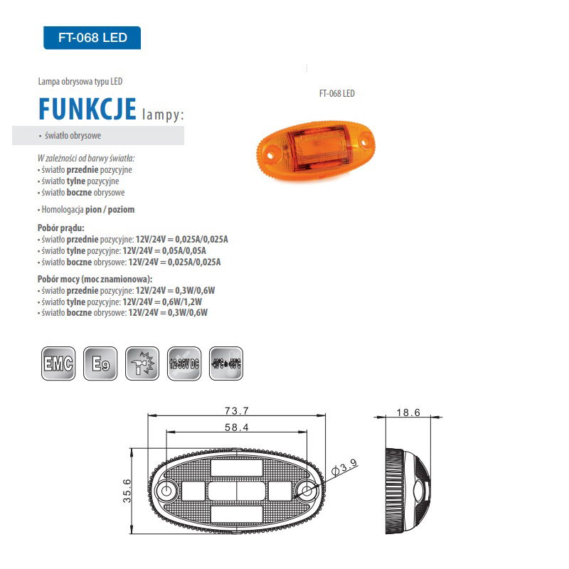 Lampa obrysowa LED 12V 24V Pomarańczowa Lampka boczna Naczepa Laweta kable