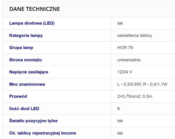 - oświetlenie tablicy rejestracyjnej: 12V/24V = 0,02A/0,02A