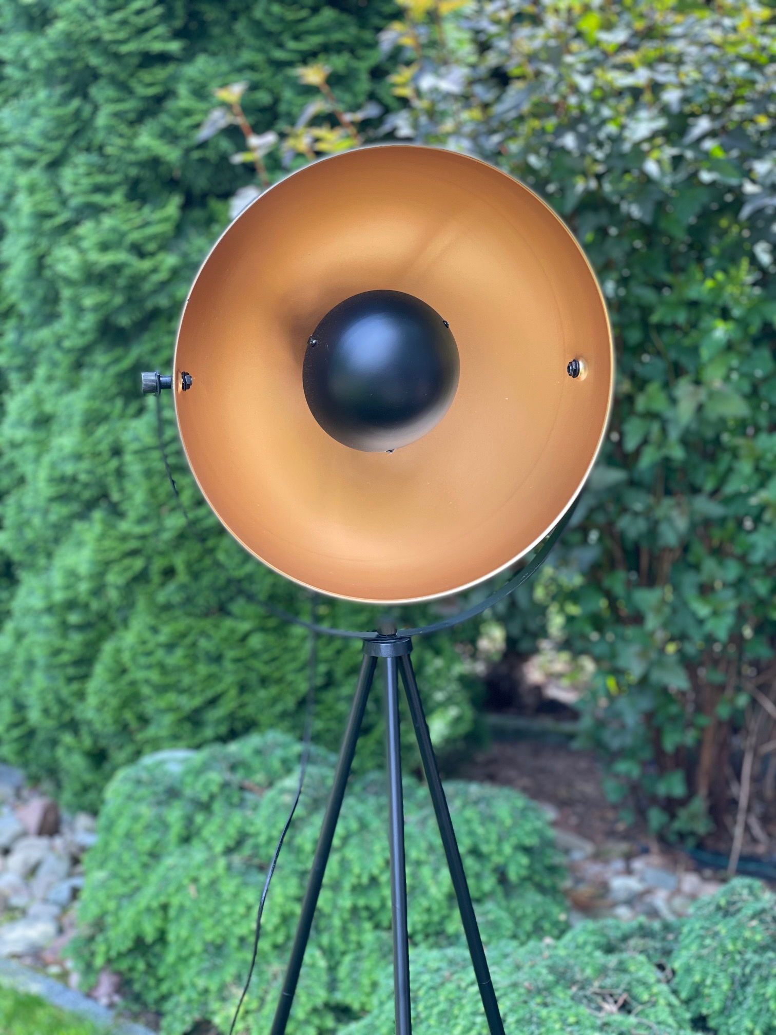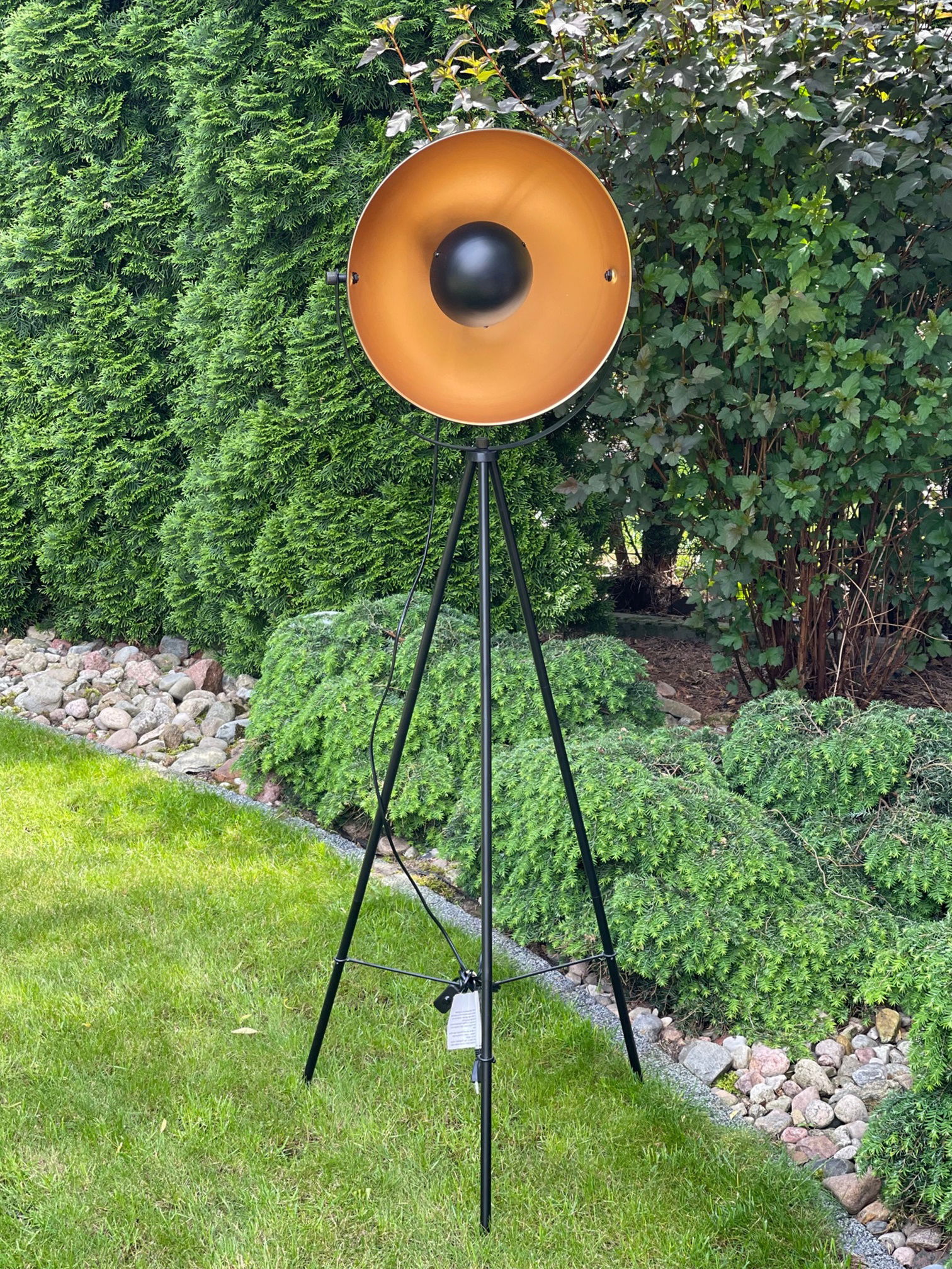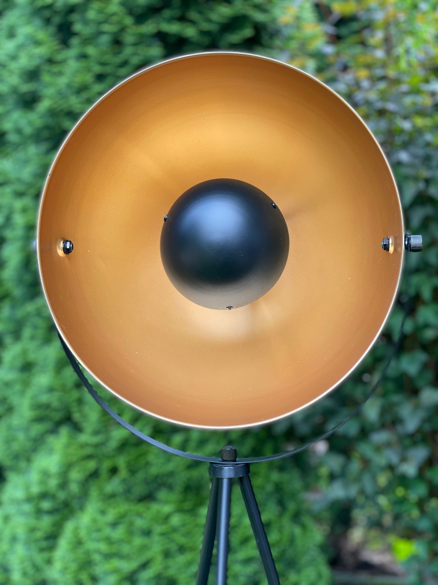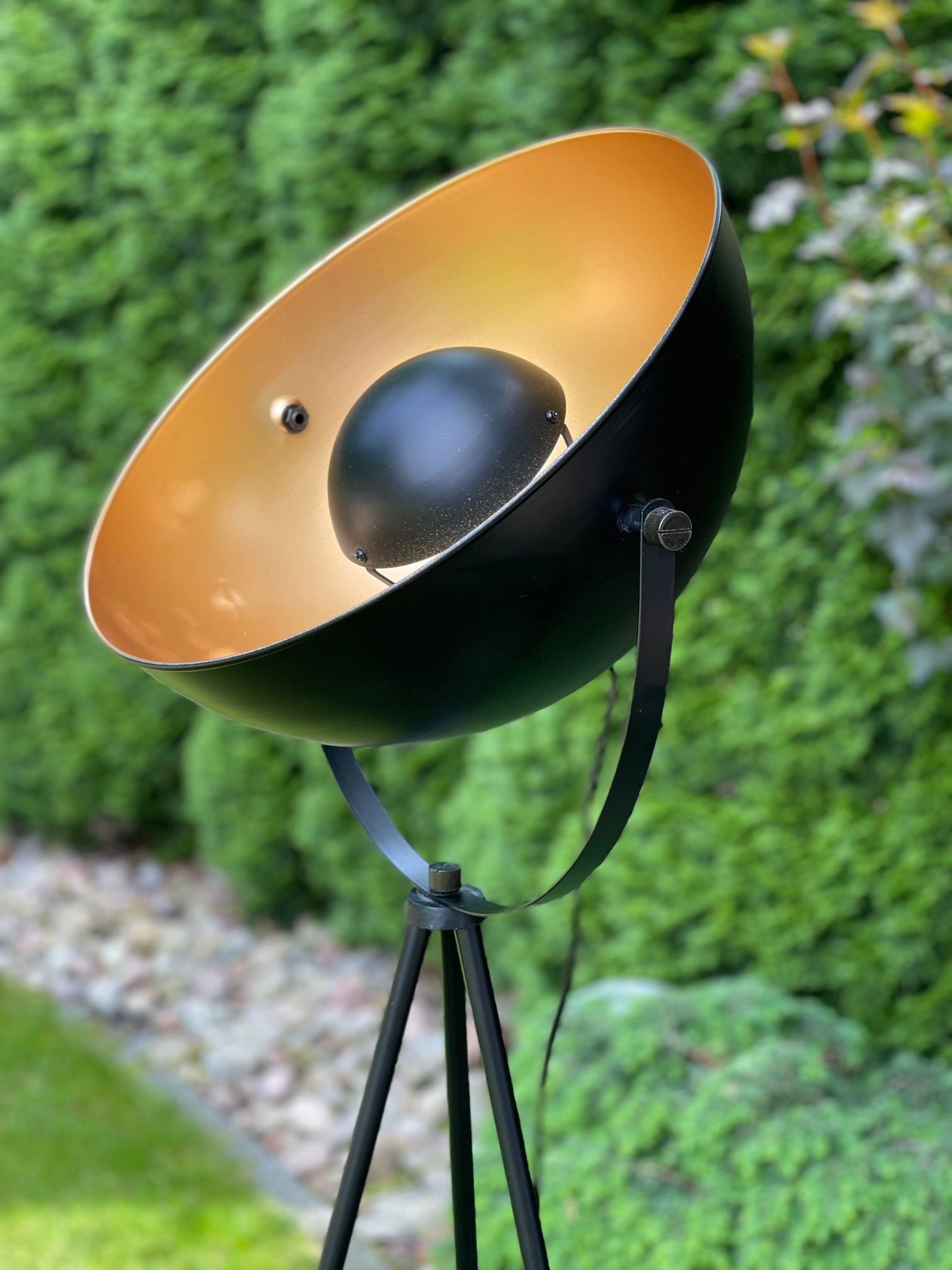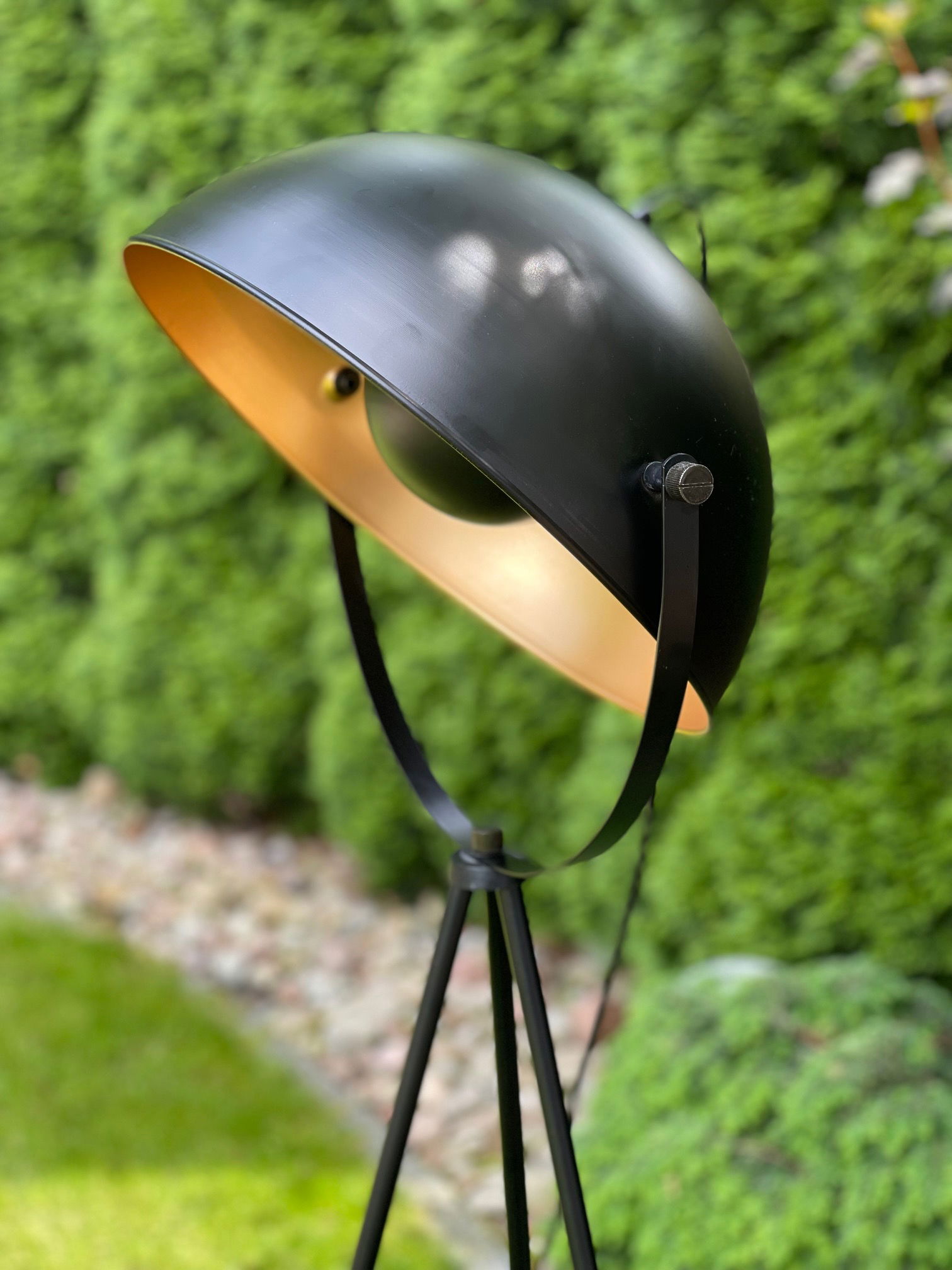 Model lampy z 3 nogami tzw. trójnóg wykonany z metalu. Klosz lampy metalowy ze złotym wnętrzem co zapewnia niepowtarzalny efekt ciepłego i nastrojowego światła.