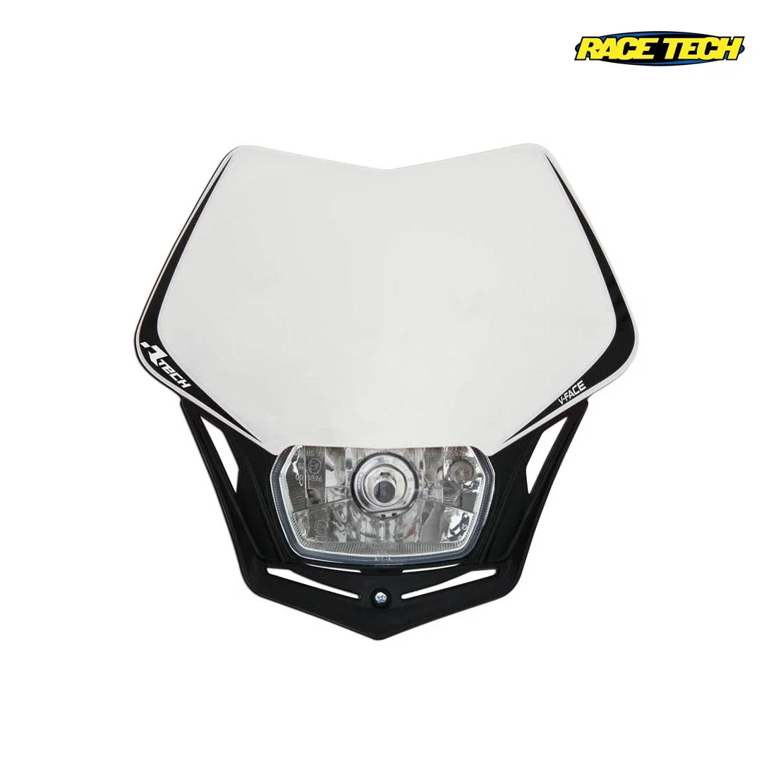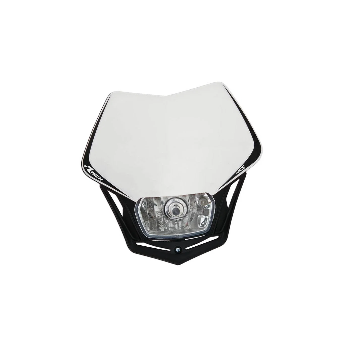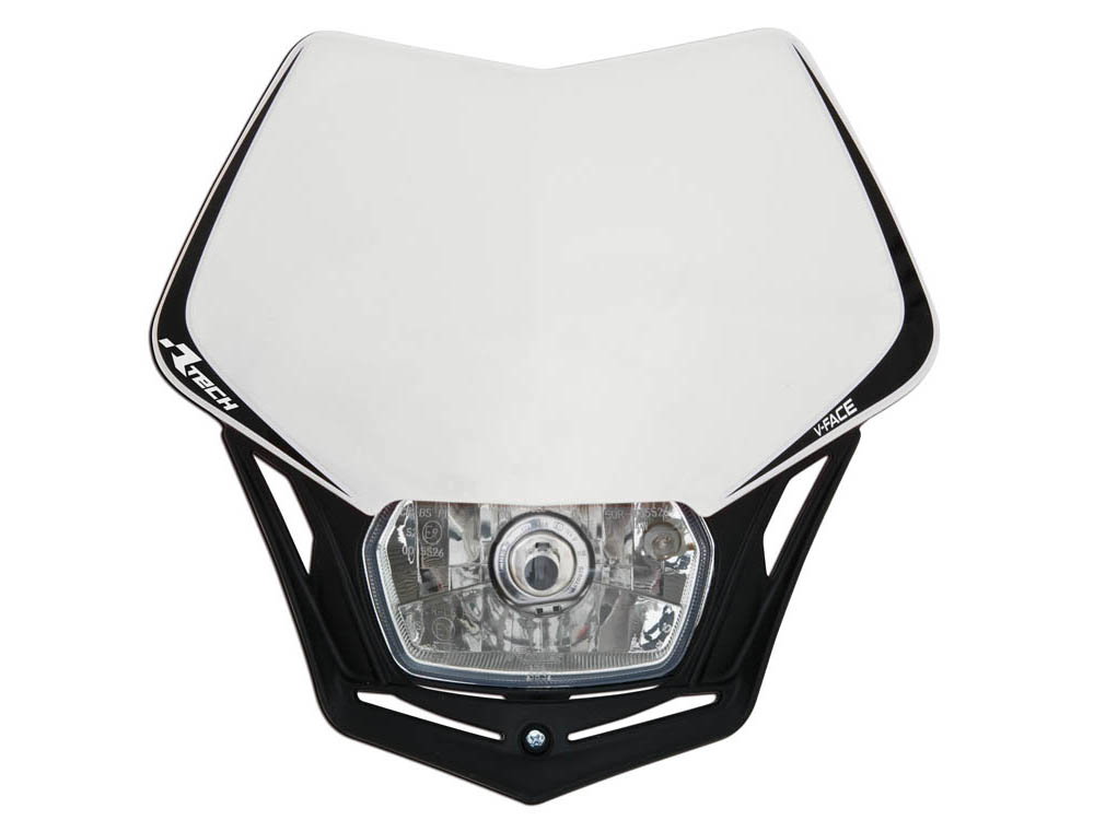 RACETECH (RTECH) LAMPA PRZEDNIA V-FACE KOLOR BIAŁY / CZARNY - Uniwersalny reflektor przedni przeznaczony do motocykli off-road, enduro i supermoto, zapewniający oświetlenie drogi oraz poprawę widoczności pojazdu.