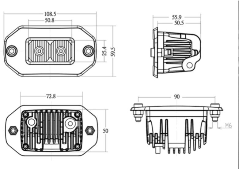 Wodoszczelność IP 68 Bezawaryjne działanie 50 tys h Światło białe zimne 6000K Test moc 12V 1,1A Szeroki kąt świecenie 120 stopni Wymiary otworu do montażu 74x48x65 mm Wymiary lampy 108,7x57x65 Rozstaw śrub montażowych 95mm