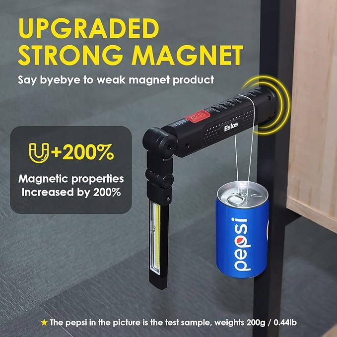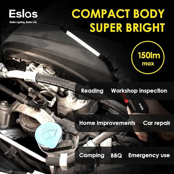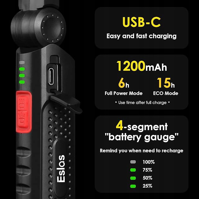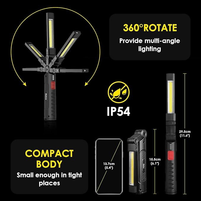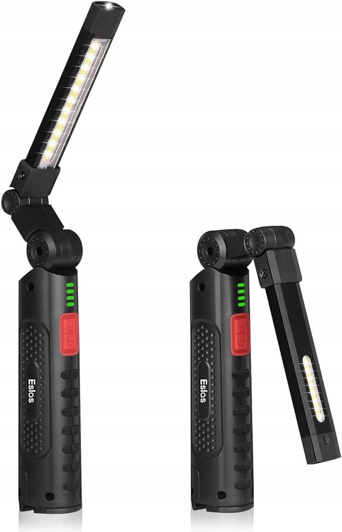 - 7 trybów oświetlenia i możliwość obrotu o 360°: Lampa robocza Eslas LED ma 3-stronne źródło światła, reflektor SMD LED na górze, światło powodziowe COB z przodu iz tyłu, dwa przyciski do przełączania 7 trybów światła. Unikalna funkcja pamięci dla wygodnego użytkowania. Ta ładowalna lampa robocza może być obracana o 360° w przód i w tył, aby zapewnić oświetlenie pod różnymi kątami. Dobry wybór na prezent z okazji Dnia Ojca.