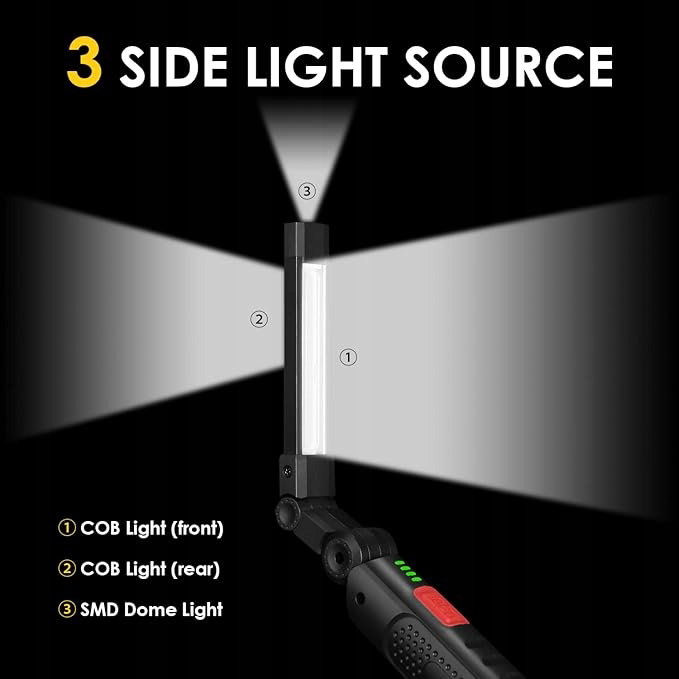 - Możliwość ładowania przez USB: Ta magnetyczna lampa robocza COB ma wbudowany akumulator i jest dostarczana z kablem ładującym USB-C ułatwiającym ładowanie. 16 godzin pracy na baterii dla światła SMD (góra) przy niskim poziomie naładowania. Po pełnym naładowaniu światło może być używane przez 6 godzin przy pełnej mocy i wysokiej jasności. Ładowanie jest wymagane natychmiast, gdy miga czerwona dioda. Wskaźnik baterii miga podczas ładowania.