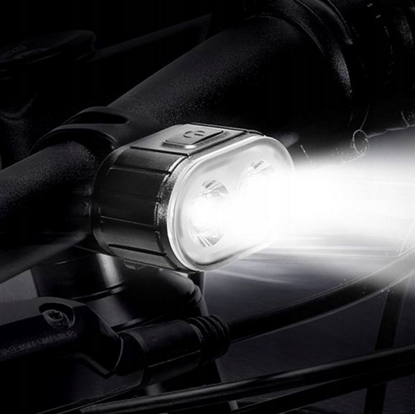 - Zestaw zawiera przednią lampkę wyposażoną w dwie wydajne diody LED, które pełnią różne funkcje — jedna z nich emituje szerokie, rozproszone światło, idealne do oświetlenia dużego obszaru przed rowerem, natomiast druga zapewnia skoncentrowane, dalekosiężne światło, które umożliwia dostrzeżenie przeszkód z większej odległości.
