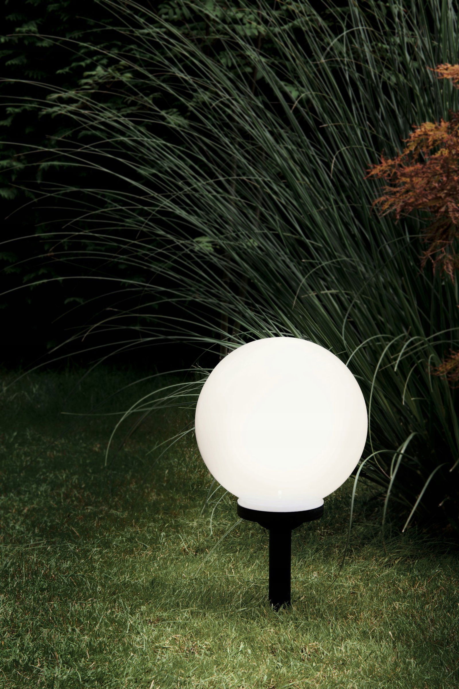 Lampa solarna ze szpikulcem do ziemi oraz z kloszem o średnicy 25 cm.