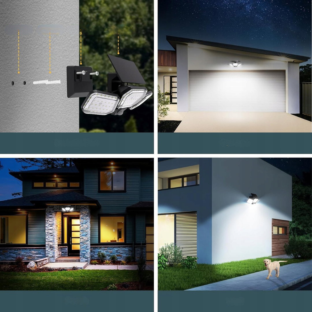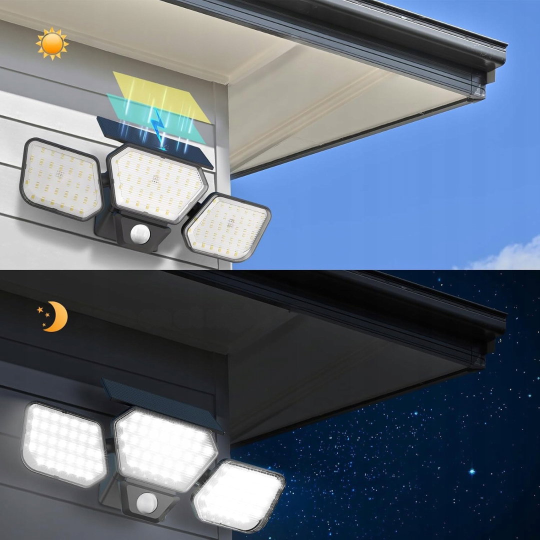 Lampa solarna Linkind z trzema głowicami to wydajne źródło światła zewnętrznego wyposażone w czujnik ruchu i 108 diod LED, które zapewniają jasność 1600 lumenów.