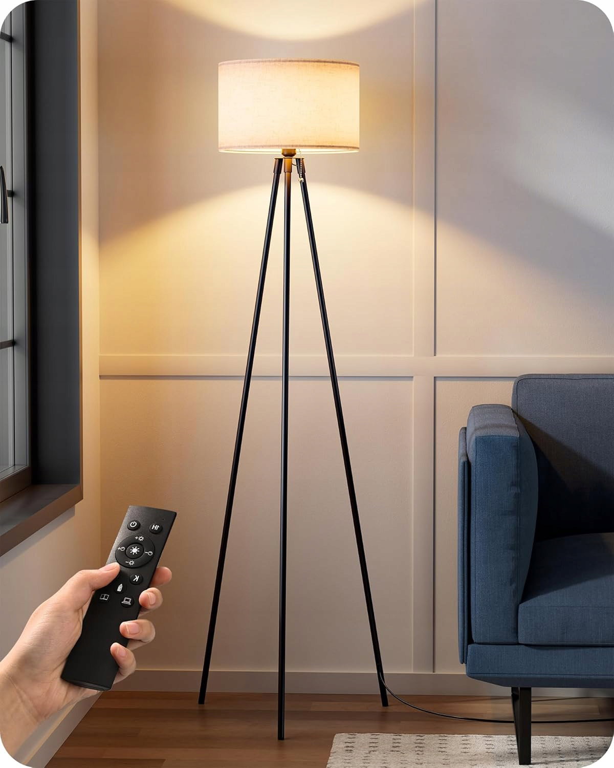 EDISHINE Lampa stojąca do salonu, trójnożny statyw z metalu, LED ściemniana za pomocą pilota zdalnego sterowania, lampa stojąca z lnianym kloszem, lampka do czytania do sypialni, pokoju dziecięcego, w [Klasa energetyczna A]