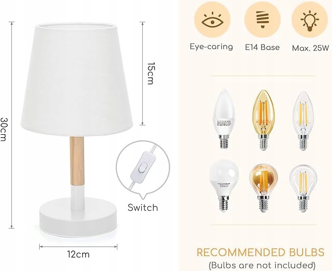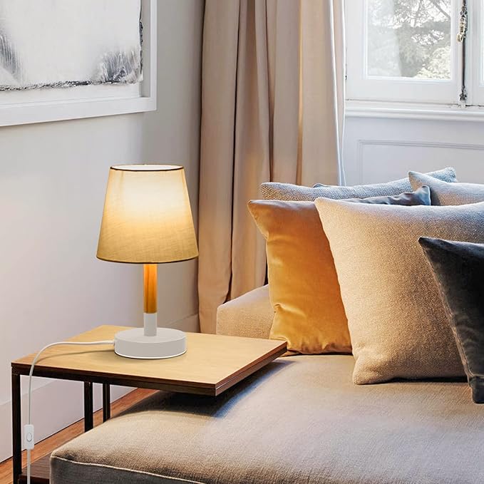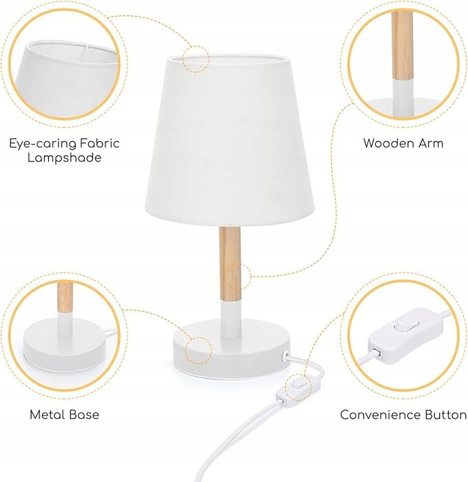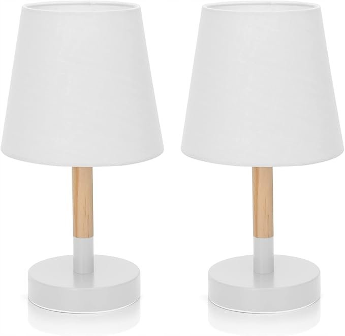 Aigostar lampa stołowa, mała drewniana lampka nocna, lampa biurkowa z białym abażurem z tkaniny i metalową podstawą, uchwyt lampy E14, zabytkowa do sypialni, salonu 2 szt