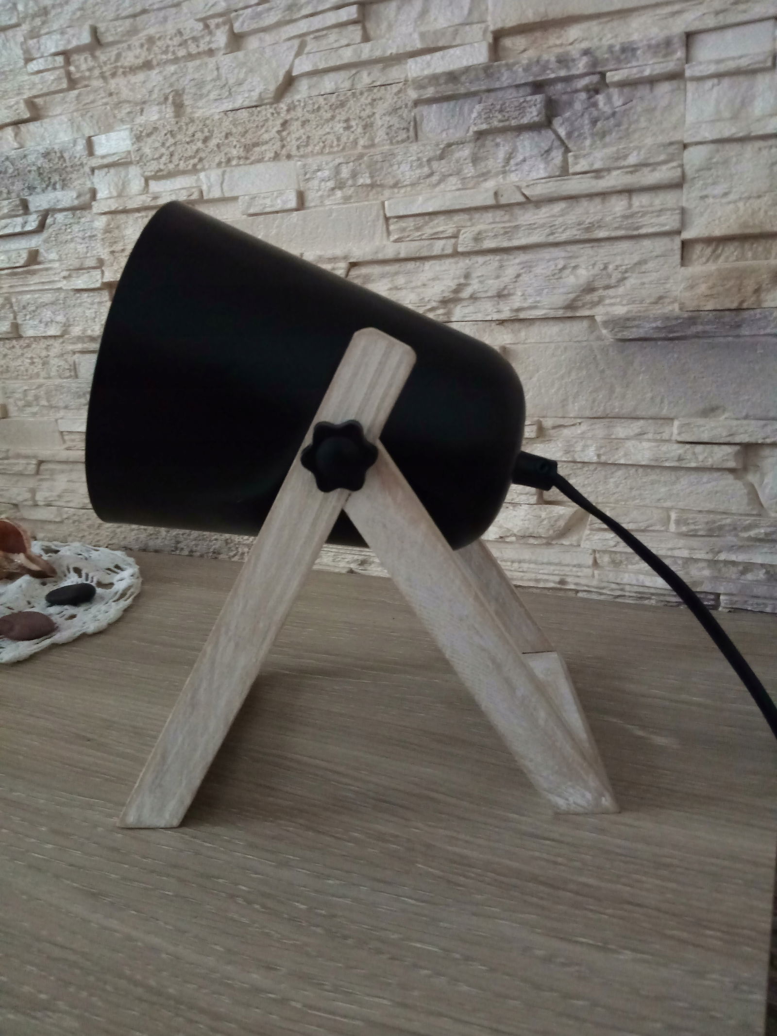 Metalowa lampka stołowa ma wyłącznik na przewodzie. Prezentowana lampa ma miejsce na jedno źródło światła.