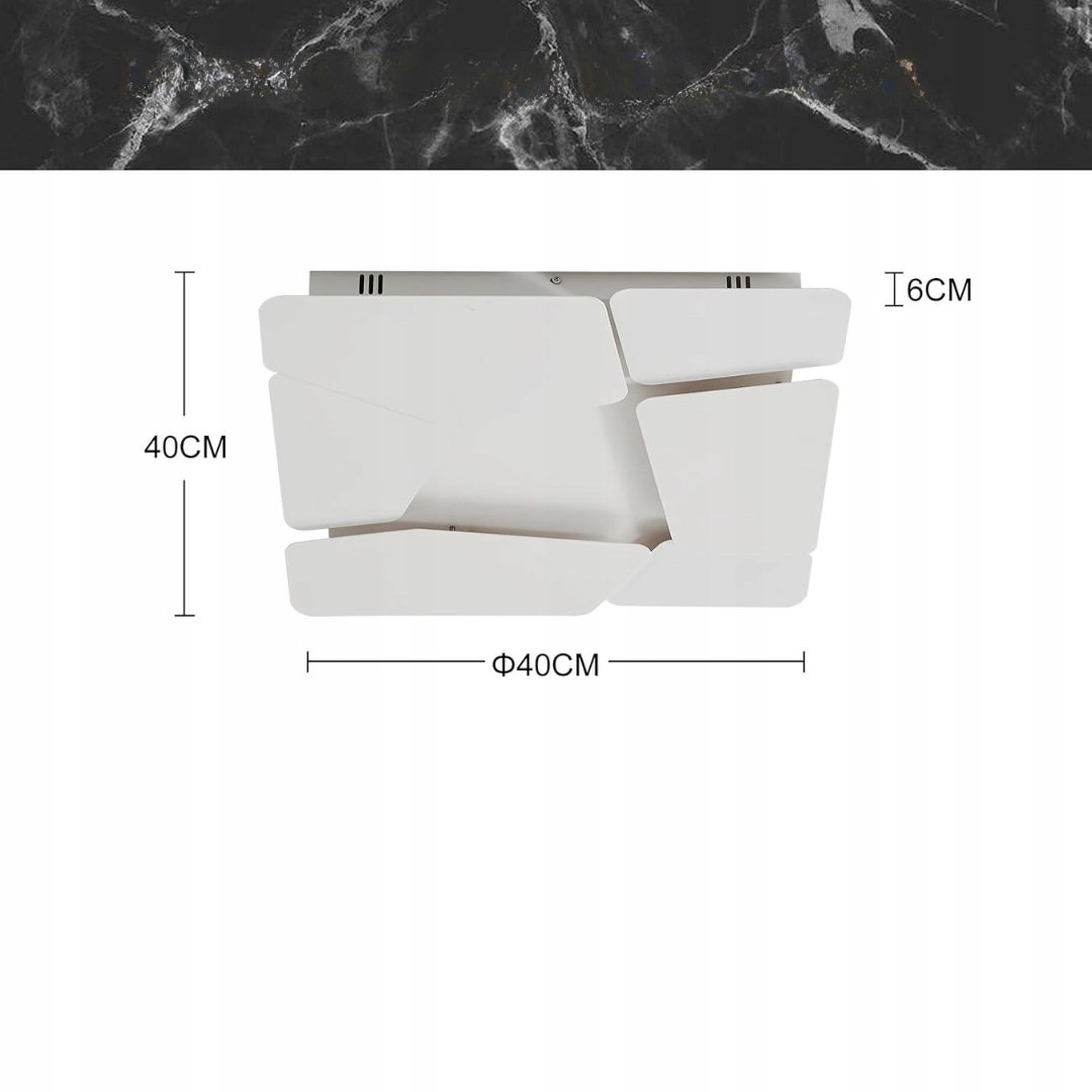 - Materiały premium: matowa, biała lampa o geometrycznym kształcie wykonana z trwałego, odpornego na odkształcenia żelaza. Wymiary wynoszą 40 cm długości, 40 cm szerokości oraz 6 cm wysokości. Zasilanie odbywa się w zakresie napięcia 220–265 V, a moc urządzenia to 37 W. Lampa efektywnie oświetla powierzchnię od 10 do 15 m².