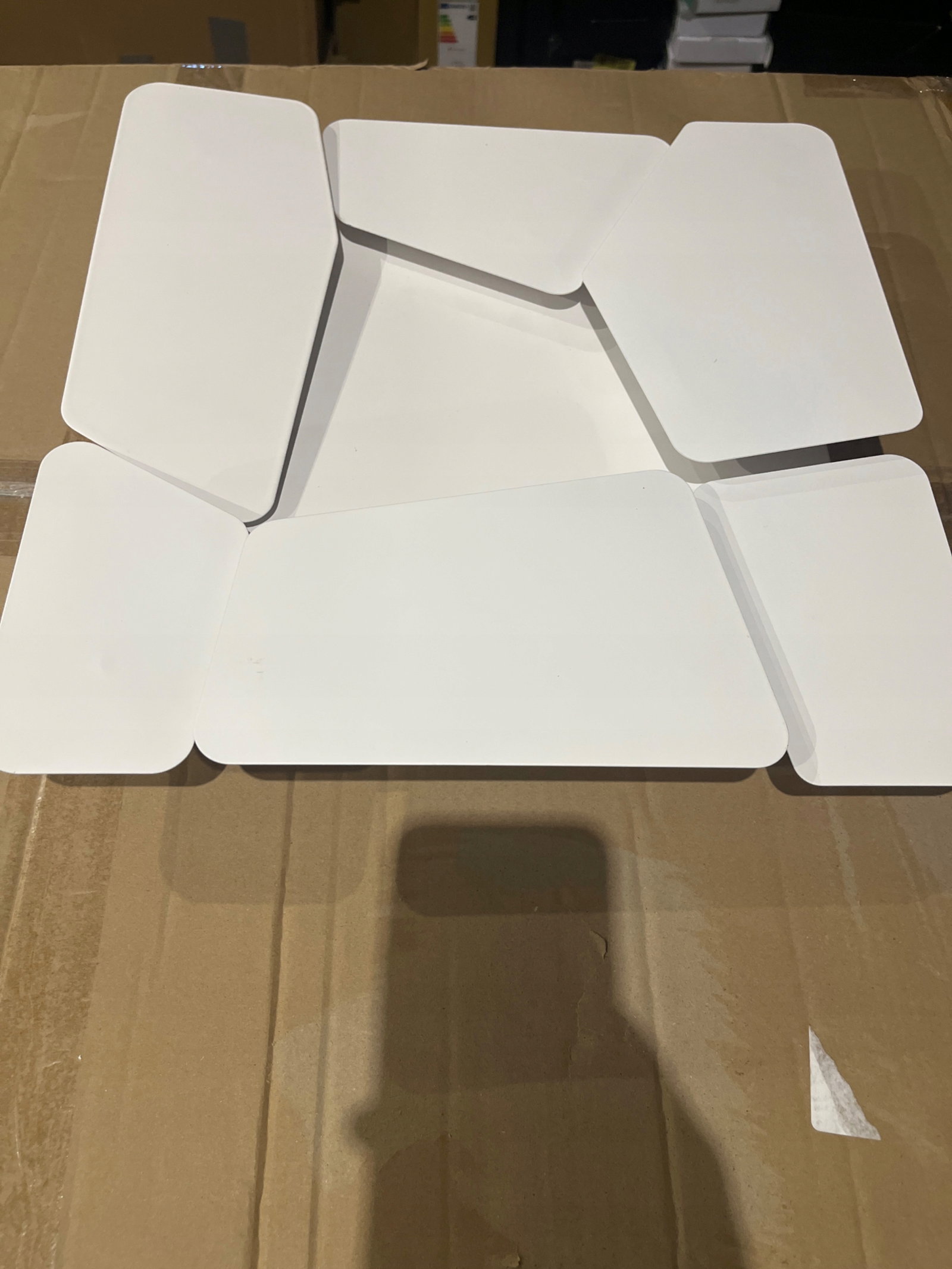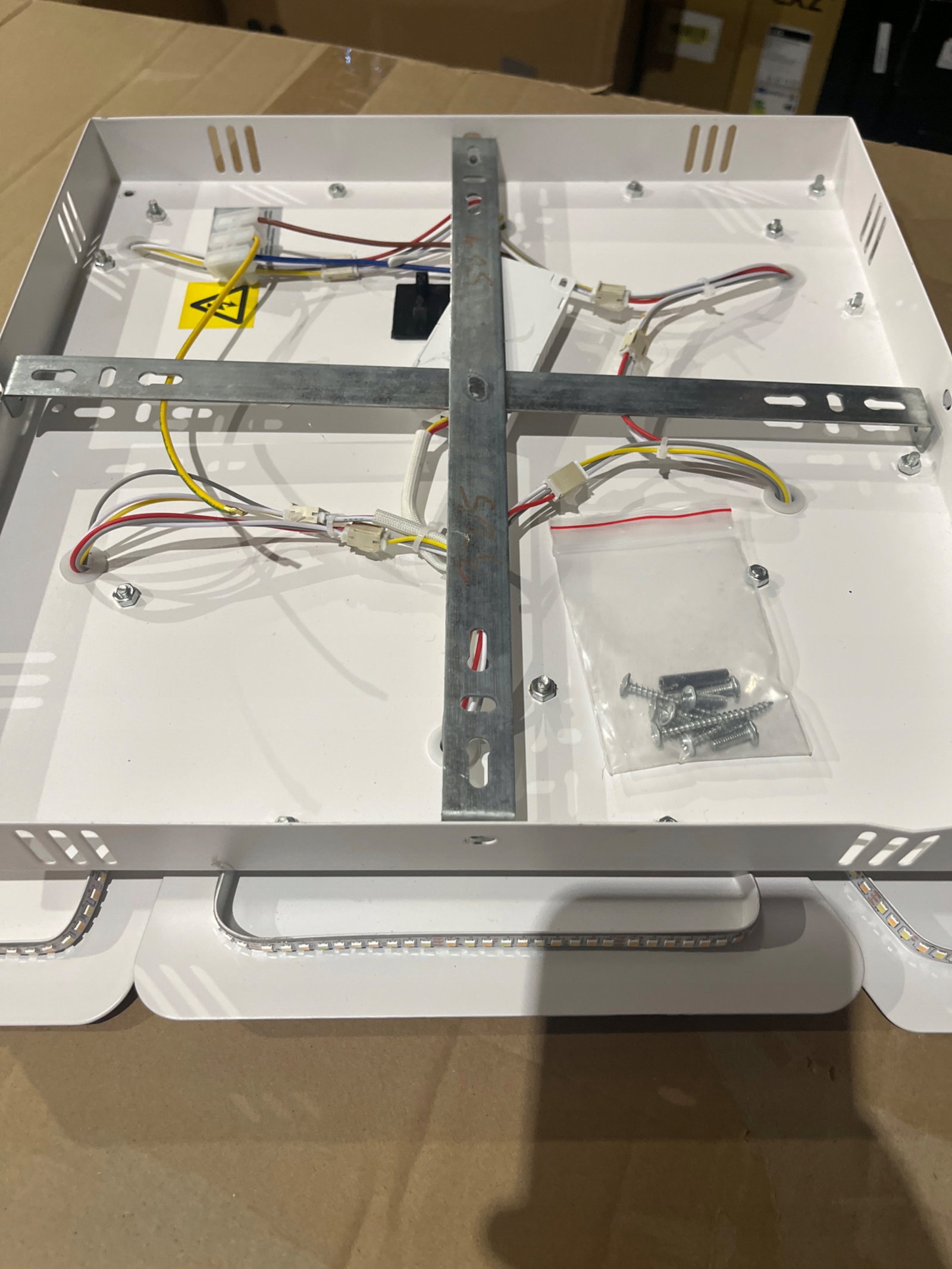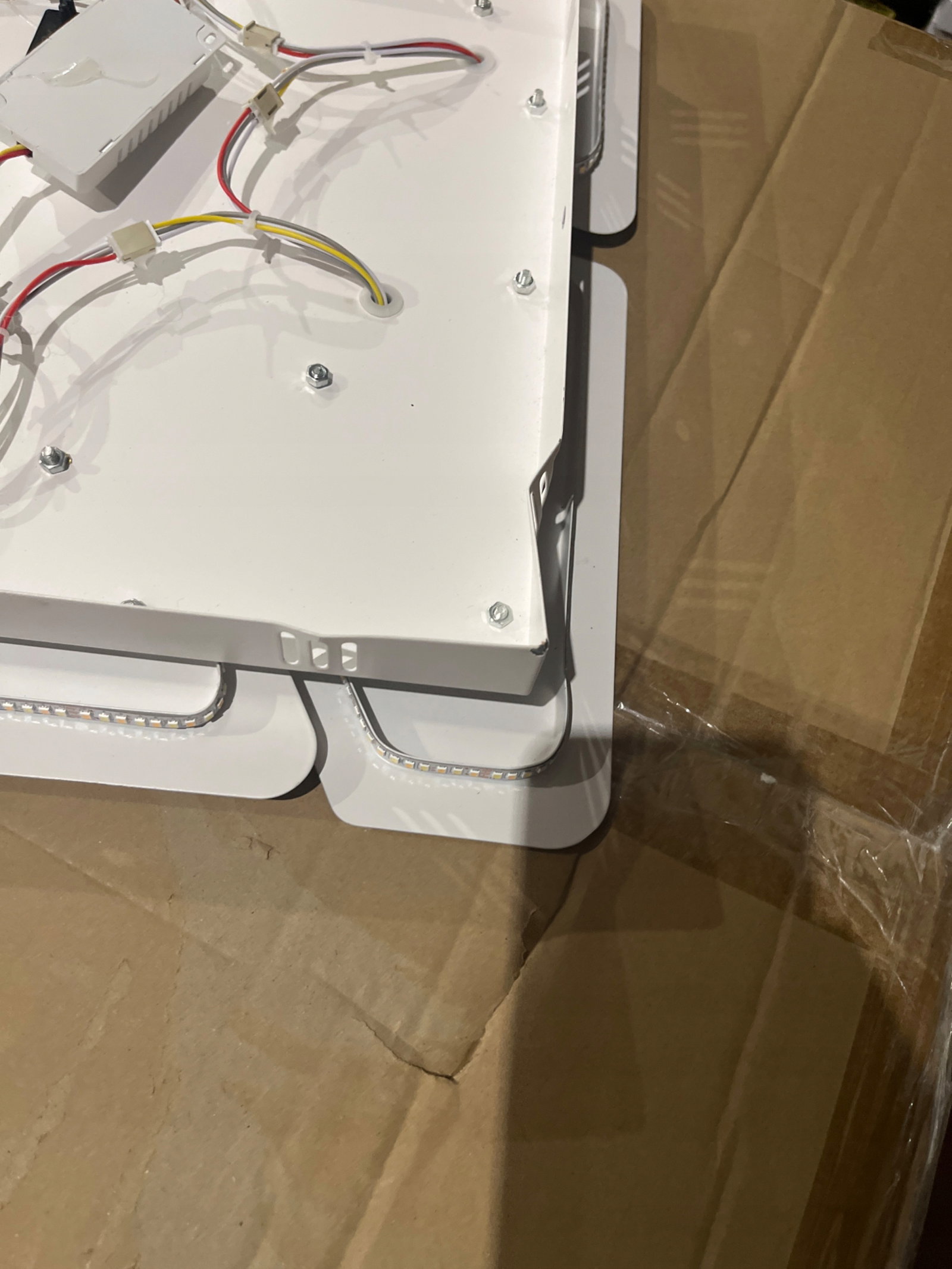 - Produkt powystawowy - uszkodzona jedna z 3 srubek mocującyhc jednen z paneli, elektryka sprawna, jedno drobne wgniecenie - praktycznie niewidoczne po powieszeniu. Stan widoczny na zdjęciach