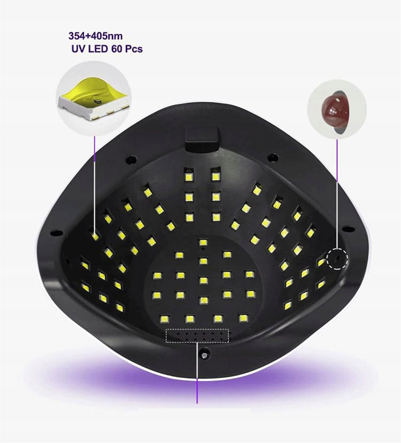 60 energooszczędnych diod zostało rozmieszczonych w taki sposób, aby stylizacja paznokci zawsze była doskonale utwardzona z każdej strony.
