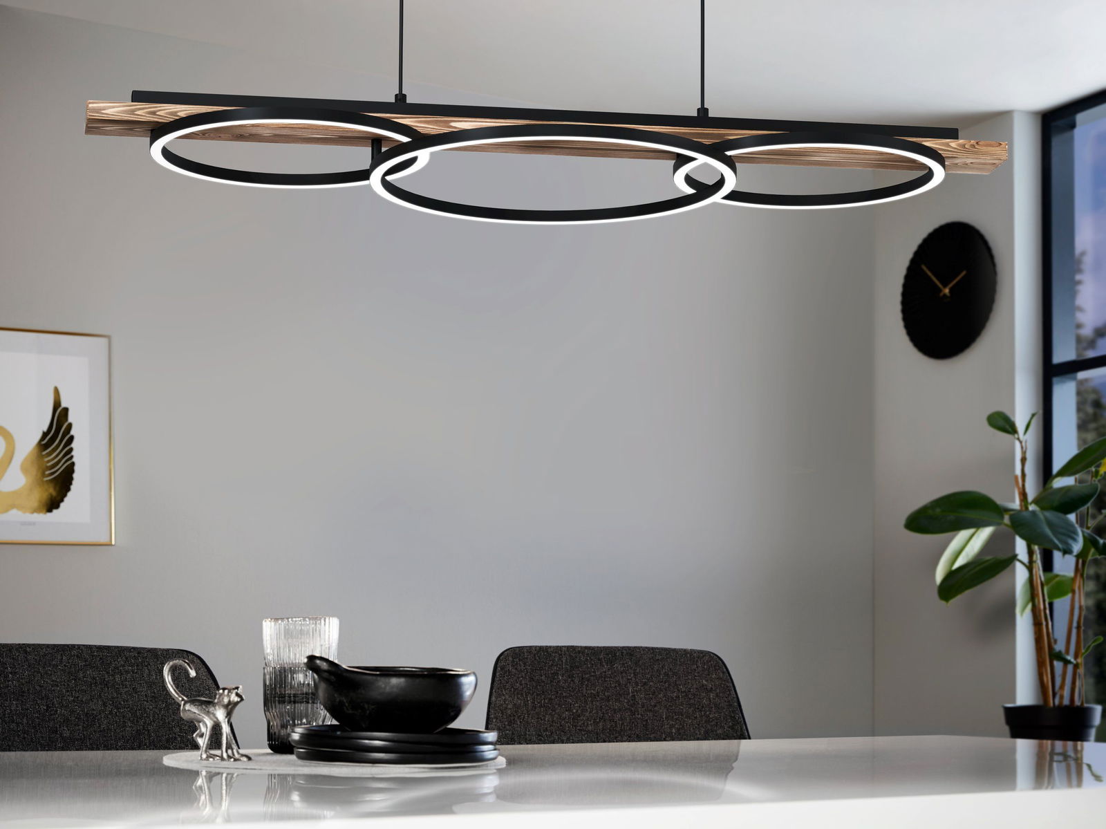 Lampa wisząca LED BOYAL wykonana jest z przypalanego drewna, do którego zamontowane są trzy czarne, okrągłe profile z diodami LED. Oprawa emituje przyjemne, ciepłe, białe światło. Dzięki połączeniu materiałów: rustykalnego drewna i chłodnego metalu, oprawa bezproblemowo wpisuje się w nowoczesne trendy oraz w stylistykę vintage. Dzięki swojemu nietypowemu, a jednocześnie minimalistycznemu wzornictwu, przyciąga wzrok w każdym pomieszczeniu. Sprawdzi się m.in. w kuchni czy też w salonie nad stołem jadalnianym.
