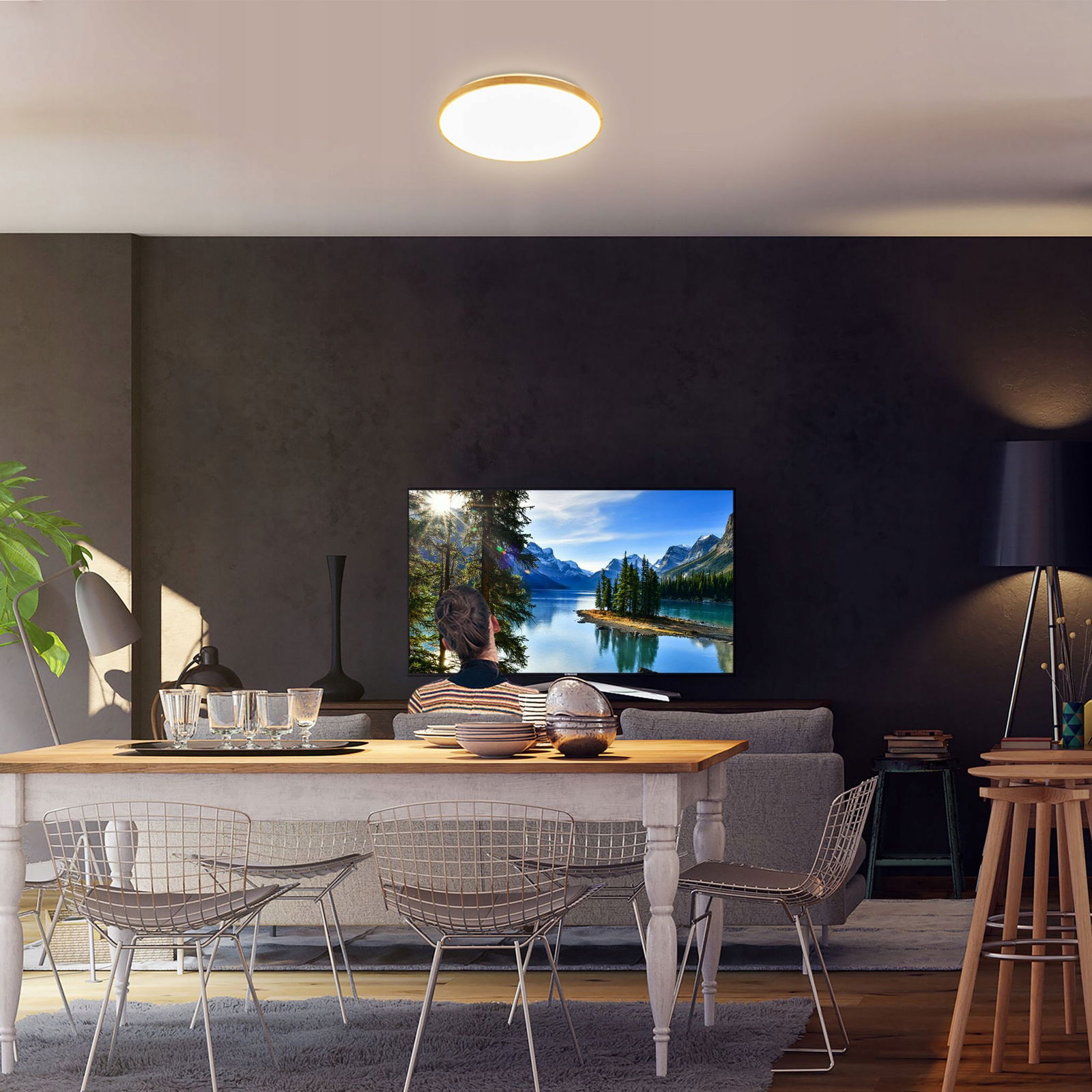 Minimalistyczna i jednocześnie stylowa, ta okrągła lampa sufitowa pasuje do Twojej przestrzeni życiowej i zapewnia przyjemne oświetlenie dzięki zamontowanym na stałe diodom LED.
