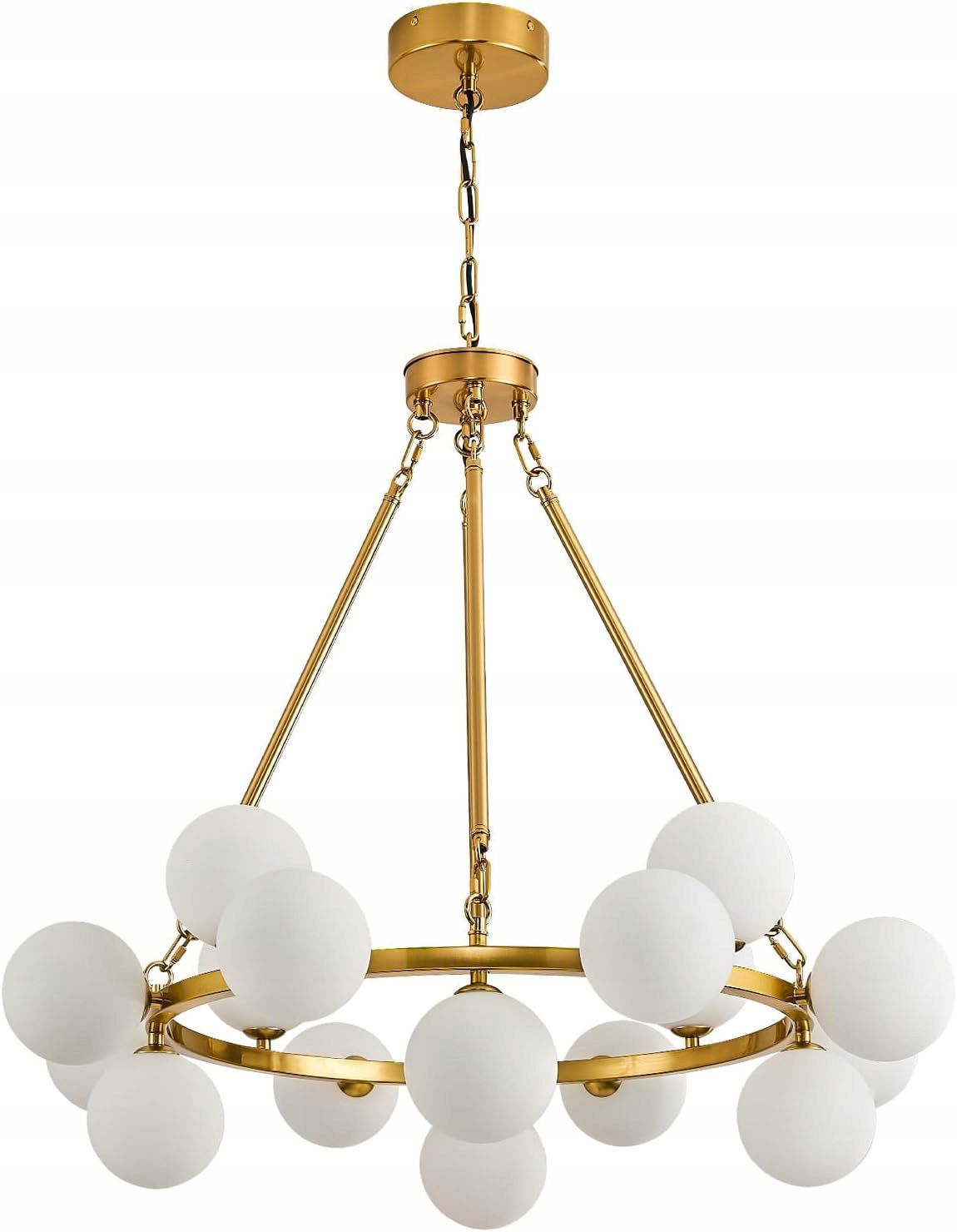 Nowoczesny złoty żyrandol, biała szklana kula, 16-punktowy design, regulowana zabytkowa lampa wisiorkowa, półwpuszczana lampa sufitowa, odpowiednia do salonu, jadalni i kuchni