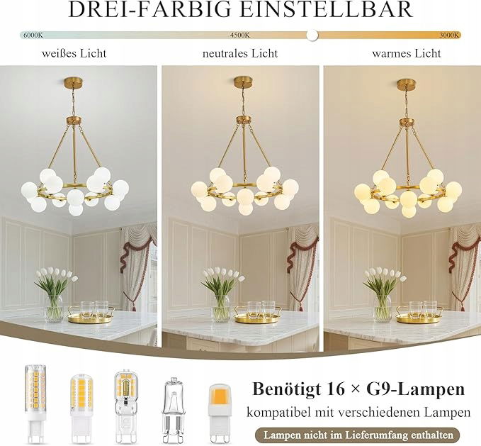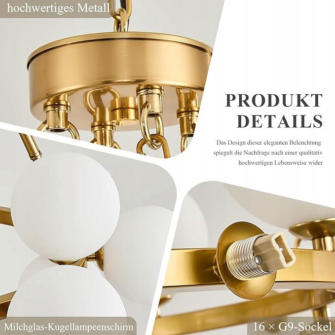 - 【16 Białych Szklanych Kul – Miękkie Światło o Głębi】Wyposażone w 16 okrągłych białych szklanych kloszów, które dają miękkie i równomiernie rozłożone światło. W połączeniu z żarówkami G9 (bez zestawu) tworzy grę ciepłego i atmosferycznego światła o głębi i elegancji.