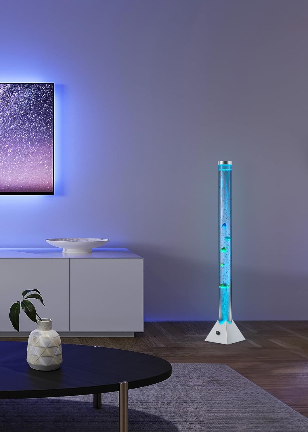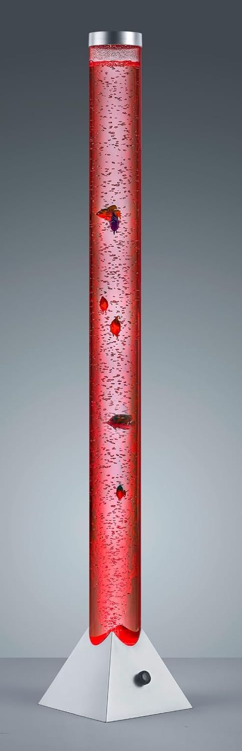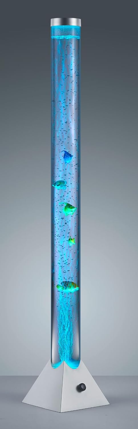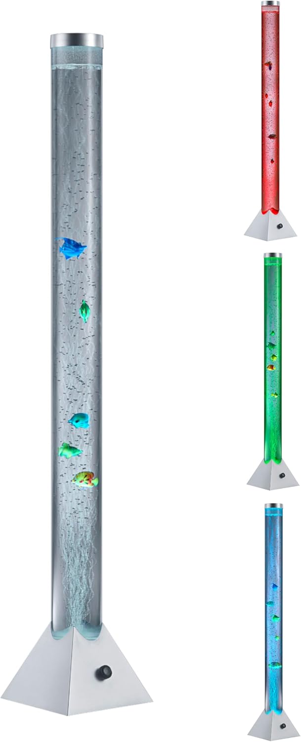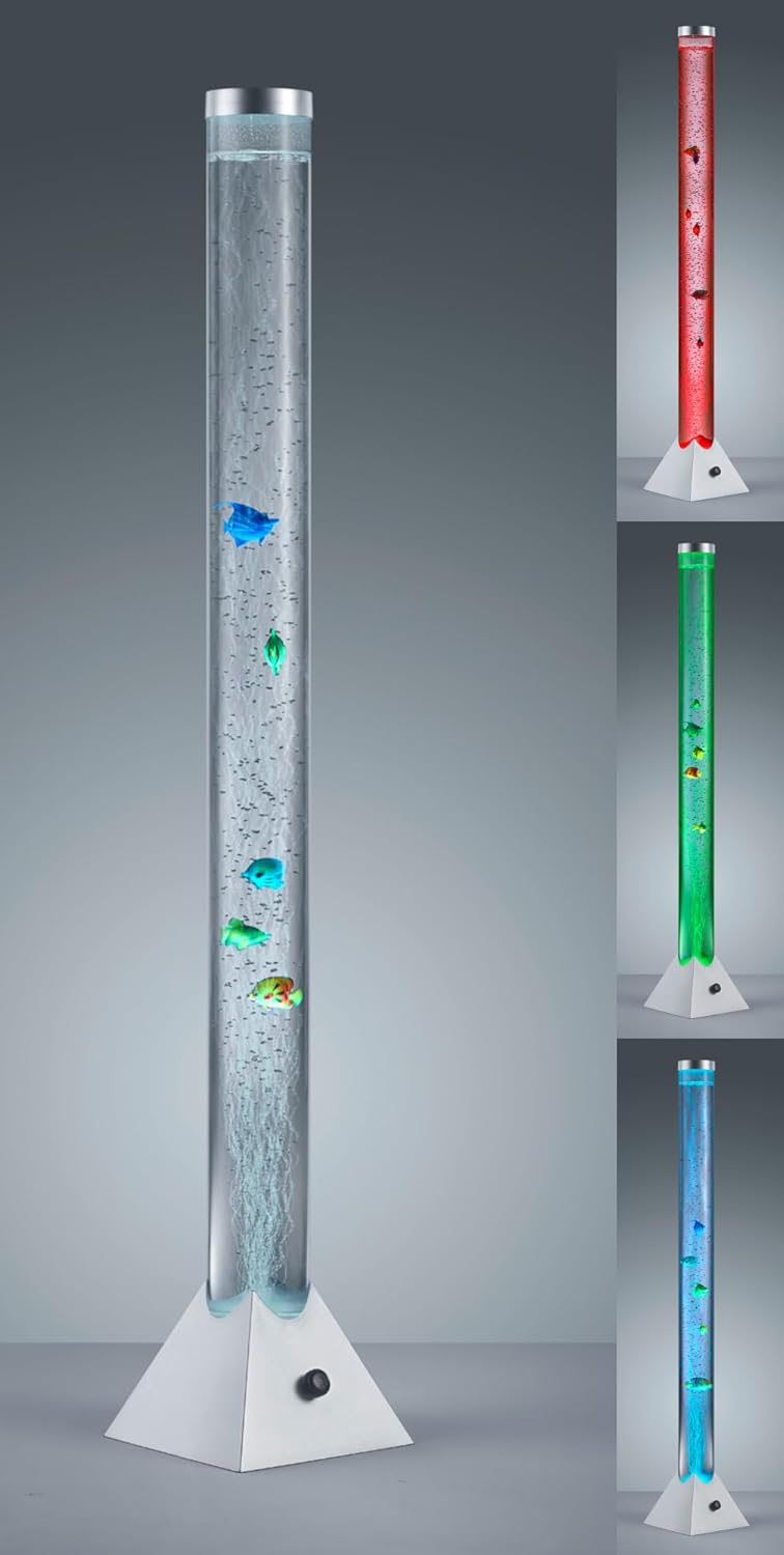 Przyciągająca wzrok kolumna wodna LED RGB to nowoczesna lampa dekoracyjna, która nie tylko ozdobi Twoje wnętrze, ale też pomoże Ci się zrelaksować po długim dniu. Wysoka na 130 cm kolumna z przezroczystego tworzywa sztucznego w kolorze tytanu została wyposażona w energooszczędne podświetlenie LED z funkcją zmiany kolorów, dzięki czemu stwarza niesamowity efekt świetlny i bąbelkowy. Wewnątrz unoszą się pięć ozdobnych rybek, które poruszają się w rytm przepływających pęcherzyków powietrza. Idealna do salonu, biura, pokoju dziecka, gabinetów terapeutycznych i przestrzeni relaksacyjnych. Wystarczy wlać wodę destylowaną i cieszyć się wyjątkowym efektem przez długi czas!