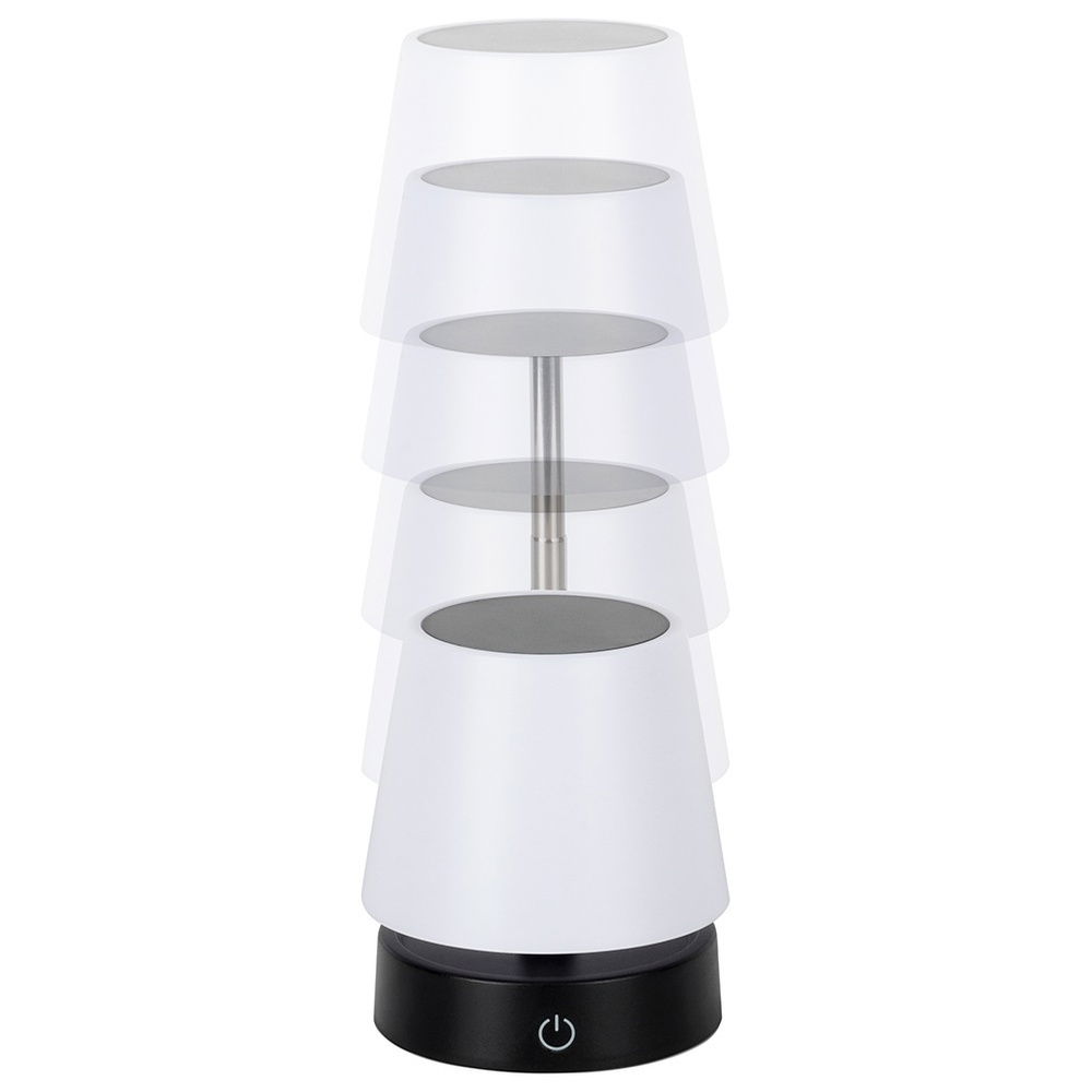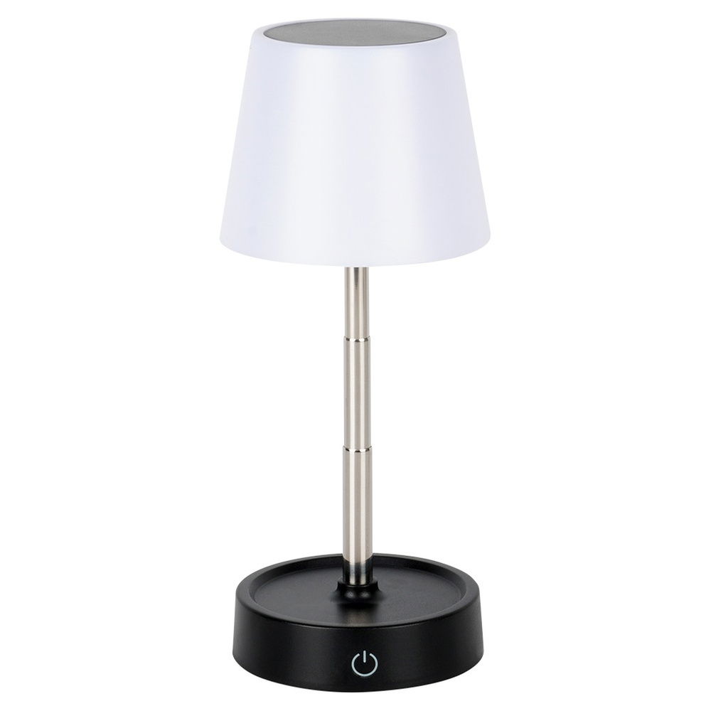 Lampka stołowa LED o regulowanej wysokości od 11 - 29,5 cm - Dekoracyjna lampa stołowa z regulowaną wysokością. Średnica klosza wynosi 10,5 cm. Lampka posiada 12 diod LED. Idealna do postawienia na biurku, komodzie, a nawet stole. Podstawa wykonana z tworzywa w czarnym kolorze, klosz wykonany z tworzywa w białym kolorze. Regulowany stelaż lampki wykonany z metalu w srebrnym kolorze. Posiada trzy filcowe podkładki.