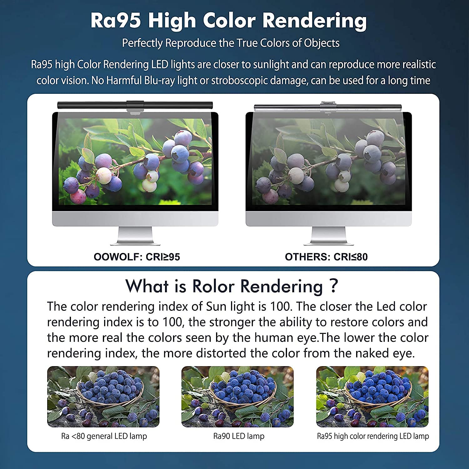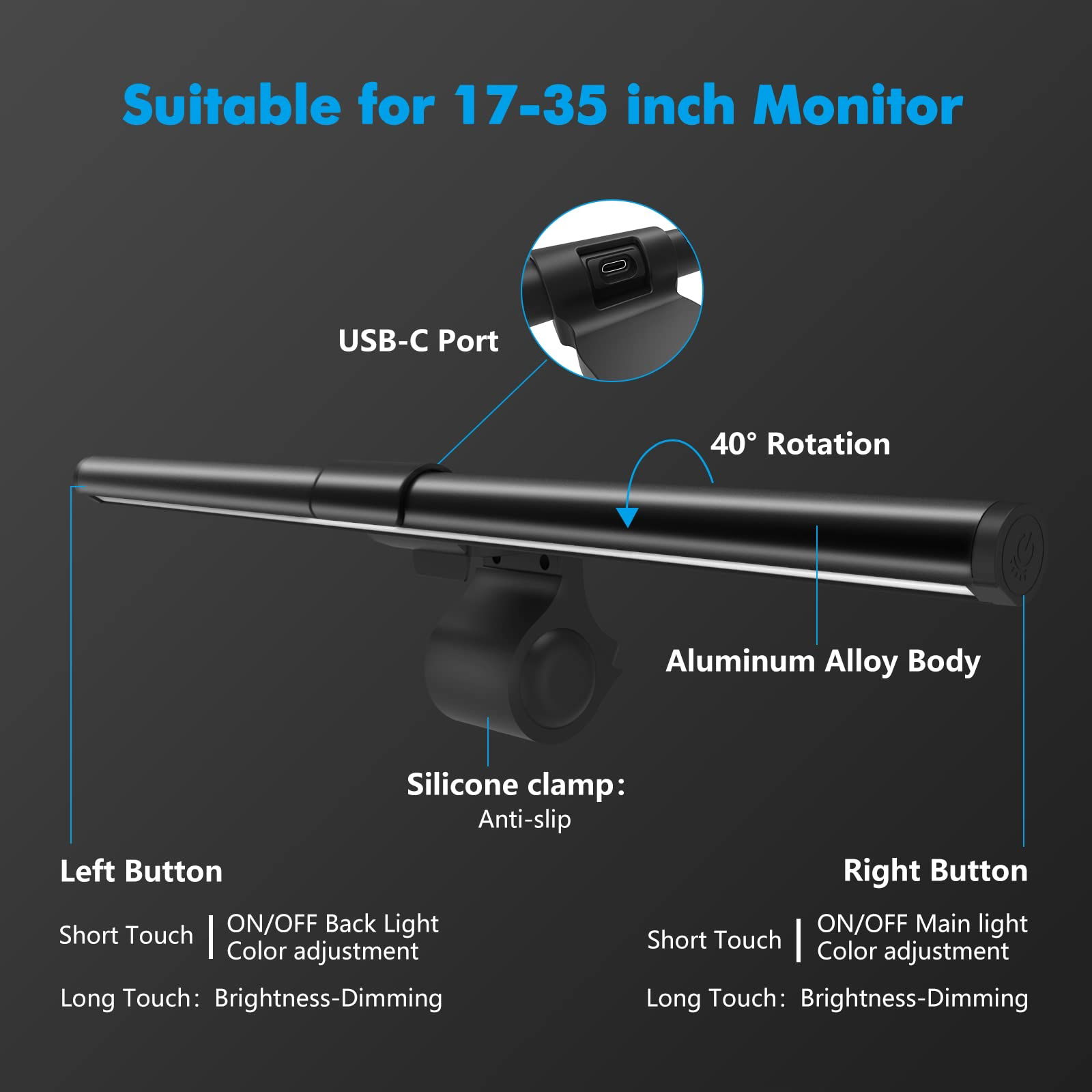 Lampa na monitor zainspirowała użytkowników komputerów swoim niezwykle wysokim współczynnikiem oddawania barw (CRI≥95) zapewniającym precyzyjne oświetlenie i doskonałe warunki do czytania. Ekstremalne odtworzenie prawdziwych naturalnych kolorów światła, redukcja zmęczonego wzroku, może znacznie poprawić dokładność i wydajność Twojej pracy przez długi czas. W porównaniu do innych lampek LED do monitorów, które mają tylko przednie światła, lampa ekranowa LED OOWOLF ma nową technologię dwóch specjalnych świateł (tylne oświetlenie otoczenia), które redukują nacisk i podrażnienie ciemnego otoczenia wokół oczu, zapewniając najwyższy poziom komfortu oświetlenia podczas czytania lub pracy. Dzięki 3 trybom kolorów dla światła przedniego i tylnego, każdy tryb oferuje 10 poziomów jasności regulowanych za pomocą przycisku. Urządzenie zapamiętuje temperaturę barwową i jasność po ponownym uruchomieniu po odłączeniu zasilania. Oszczędzaj czas i unikaj konieczności ponownego ustawiania. Kabel zasilający typu C i podstawa montażowa znajdują się w zestawie. Pasuje do wszystkich rodzajów komputerów.