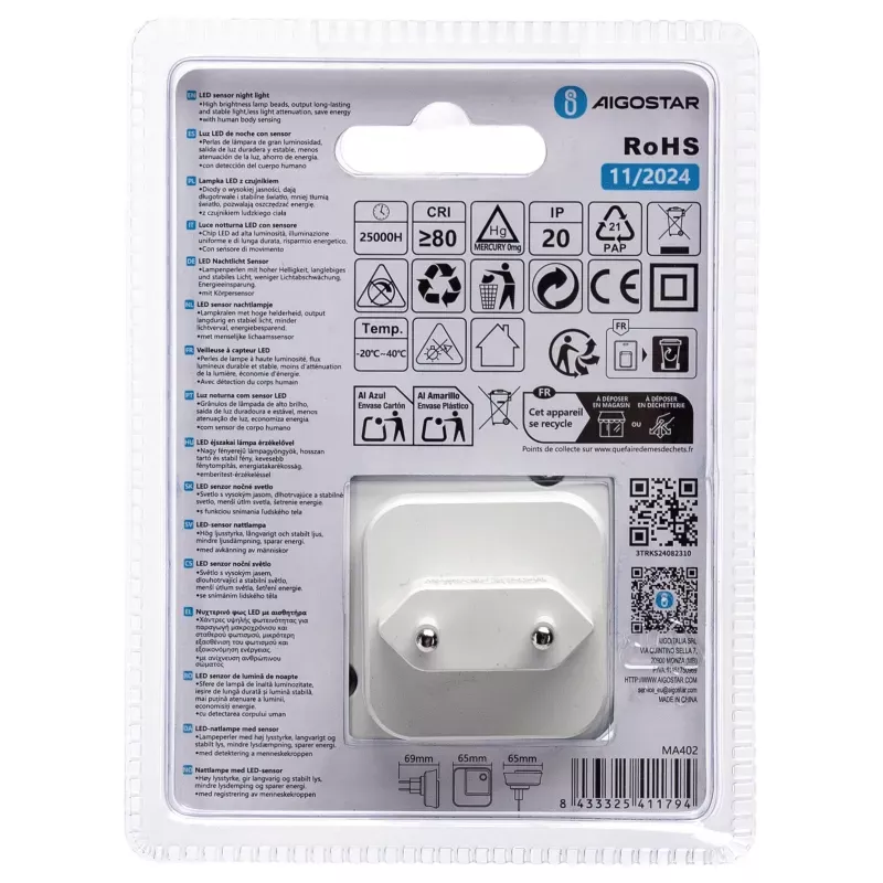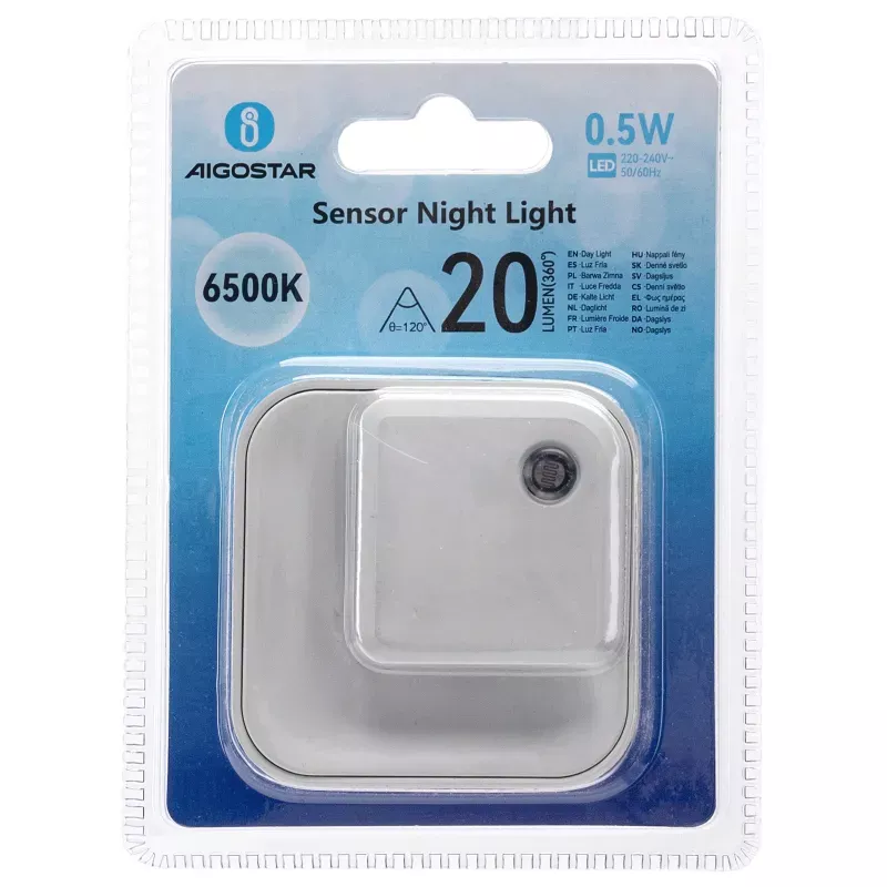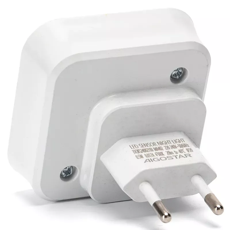 Lampka wtykana do gniazdka o chłodnej barwie światła i 20lm, idealna jako nocne światło orientacyjne w sypialniach, korytarzach lub schodach dla dzieci i dorosłych. Posiada czujnik nocy i działa automatycznie.