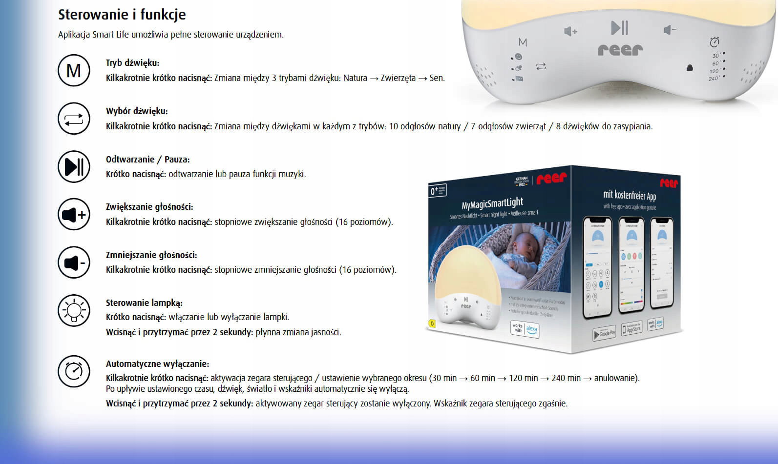 Funkcje lampki - 8 dźwięków ułatwiających zasypianie, między innymi