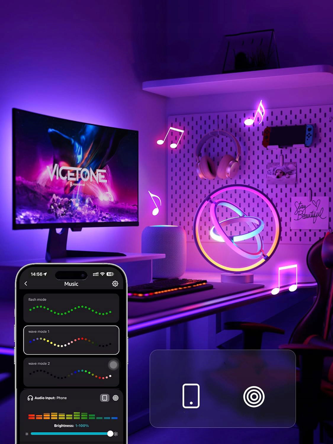 Dzięki technologii LightBeats oraz wbudowanemu czujnikowi dźwięku lampa może reagować na rytm muzyki. Kolory i efekty świetlne zmieniają się w takt ulubionych utworów, tworząc dynamiczną atmosferę idealną na imprezy, gaming lub relaks.