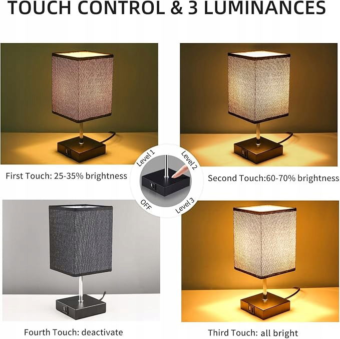 - Ściemnianie dotykowe i 3 poziomy jasności: sterowanie dotykowe. Łatwa obsługa i sterowanie lampą stołową w ciemności. Przy użyciu diody LED E14 ściemnialna żarówka ma 3 poziomy jasności, co pozwala spełnić różne potrzeby oświetleniowe. Pierwsze dotknięcie: 25-35% jasności; Drugie dotknięcie: 60-70% jasności; Trzecie dotknięcie: wszystko jasne.