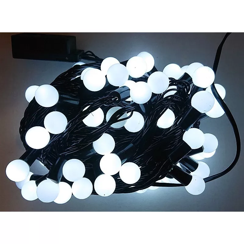 kolor kulek biały zimny. Zestaw z przelotką do podłączenia następnego zestawu lampek choinkowych. Dwudziestometrowy sznur z 200 drobnymi białymi zimnymi kulkami, średnica perełki około 1,5 cm. Lampki mają sterownik z ośmioma funkcjami w śród nich światło stałe. Zestaw posiada przelotkę do podłączenia następnego zestawu lampek choinkowych lub innych świecidełek. Parametry:
