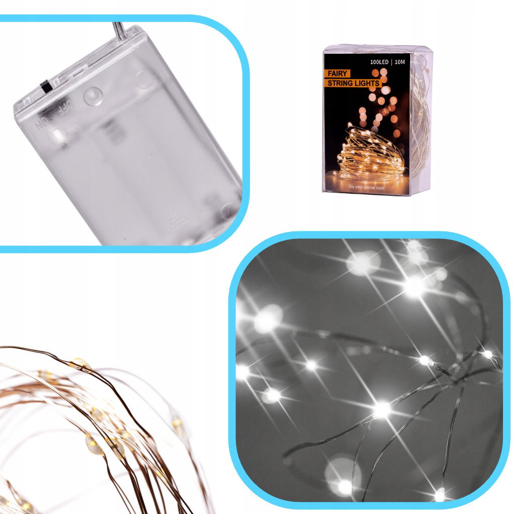 LAMPKI LED DRUCIKI DEKORACYJNE 10M 100LED ZIMNY BIAŁY