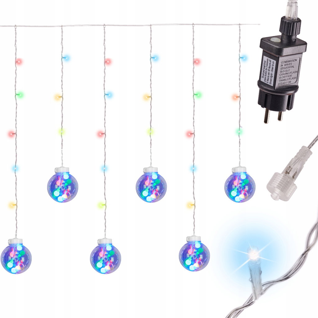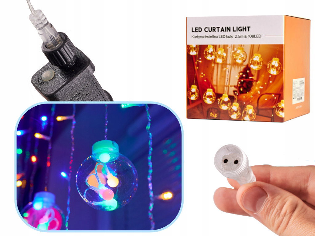 LAMPKI ŚWIĄTECZNE KULE CHOINKOWE KURTYNA NA OKNO 108 LED MULTIKOLOR
