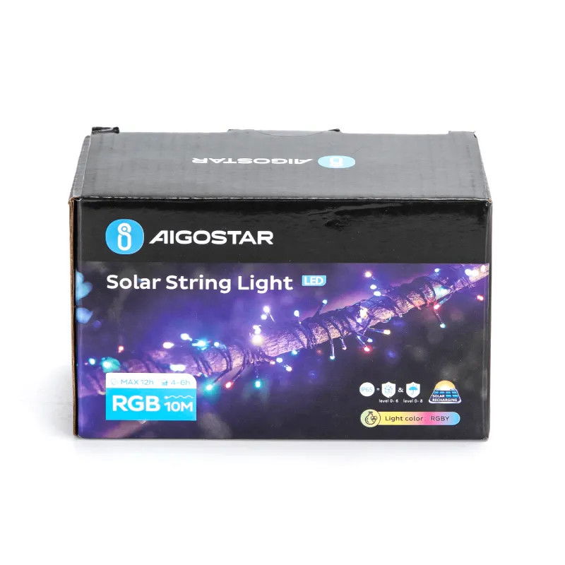 Łańcuch świetlny girlanda solarna 100 kolorowych lampek na 10 metrowym sznurze, całość ma 11,9m, kolor na stałe przypisany do lampki. Sprawdzi się jako dekoracyjne oświetlenie patio, balkonu, tarasu, ogrodu oraz imprez plenerowych. Możliwość ustawienia światła ciągłego bądź migającego. Zestaw posiada posiada panel słoneczny, który przekształca światło słoneczne w energię elektryczną. Czas pracy zależy od położenia geograficznego, codziennych warunków pogodowych i pory roku.