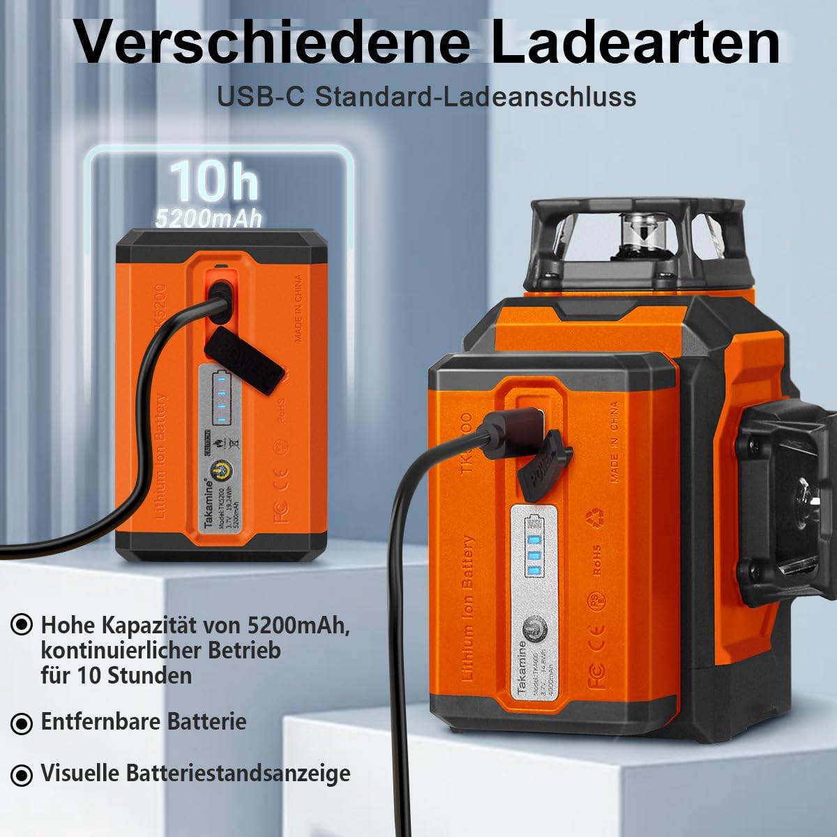 Jasne światło: poziomica laserowa wykorzystuje wysokiej jakości zielone diody laserowe, które zapewniają doskonałą jasność i większą stabilność. W tych samych warunkach oświetlenia jasność zielonego światła jest dwukrotnie wyższa niż czerwonego lasera, o zasięgu do 20 m i dokładności 10 m ±2 mm. W przypadku korzystania z liniowego odbiornika takamineTech w silnym świetle lub w warunkach zewnętrznych obszar roboczy można rozszerzyć do 45 m, dzięki zewnętrznemu trybowi pulsacji
