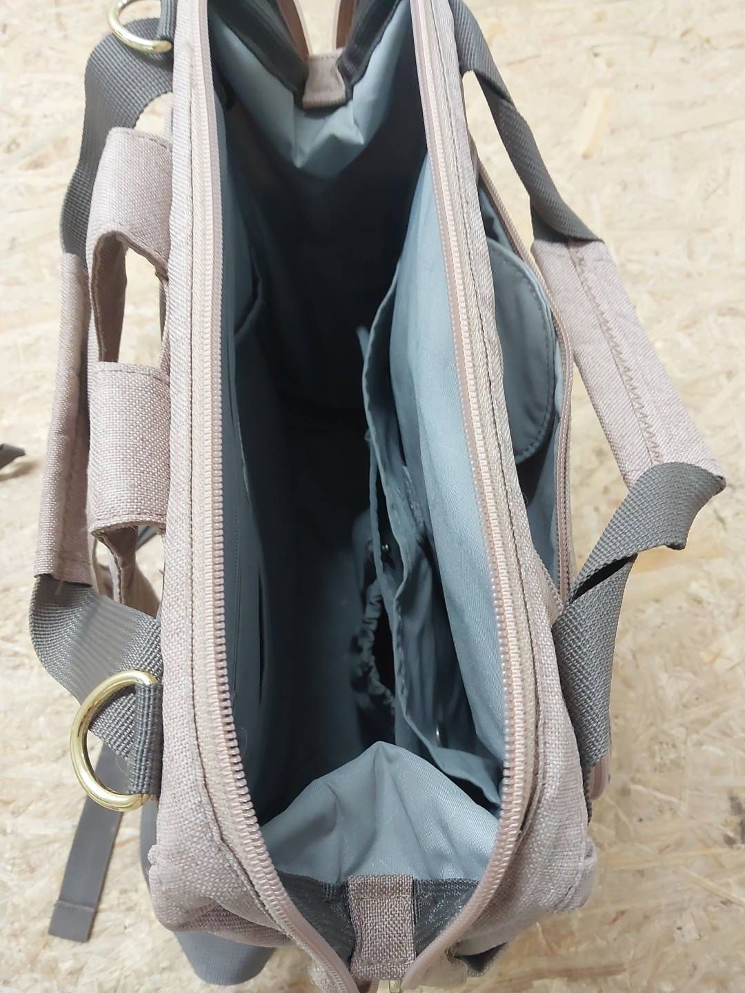 liczne kieszenie wewnętrzne, pozwalające dobrze zorganizować przestrzeń, w tym: większa wodoodporna zapinana na suwak (na mokre ubranka czy pieluszkę), dwie mniejsze otwarte, większa zapinana na rzep – przeznaczona na przewijak oraz dwie mniejsze wykończone gumką – doskonałe na słoiczki z obiadkiem czy napój, przyczepione zatrzaskami, które w razie potrzeby można odpiąć; wewnątrz idealne miejsce na chusteczki czy zapas śliniaków